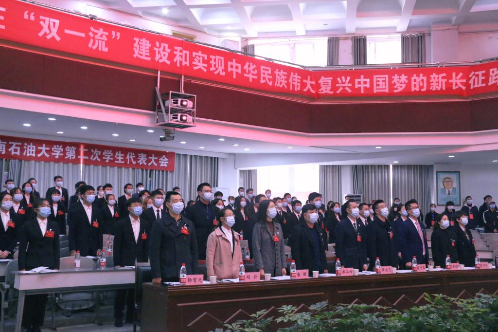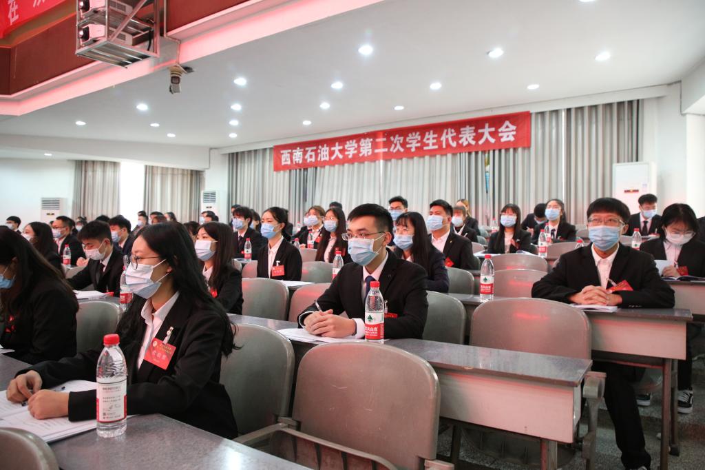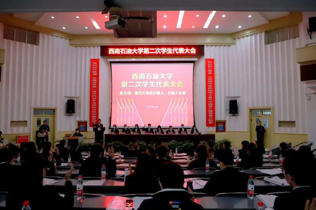 各学生代表高唱国歌后,大会正式开始。本次会议分为听取报告、选举第二届学生主席团常任委员、宣读计票情况和选举新一届学生团主席团成员四个部分。校区学生团委副书记帅涛发表提案工作报告。紧接着,学生代表们投票选取第二届常任委员。主持人说明选票填写注意事项后,各代表人有序进行投票。投票结束后,大会总记票人宣读计票结果,大会总监票人宣读选取结果。余佳鑫和李英媚成为了新一届学生会主席团成员。在团委老师李啟祥的主持下,大会表决通过了西南石油大学南充校区《学生会工作报告》和《西南石油大学学生会章程(修订草案)》的决议。大会最后,校区团委书记兼学生工作部副部长随明明发表讲话,校区新一届学生会主席代表余佳鑫致闭幕辞。此次大会在《飞翔》的歌声中圆满结束。