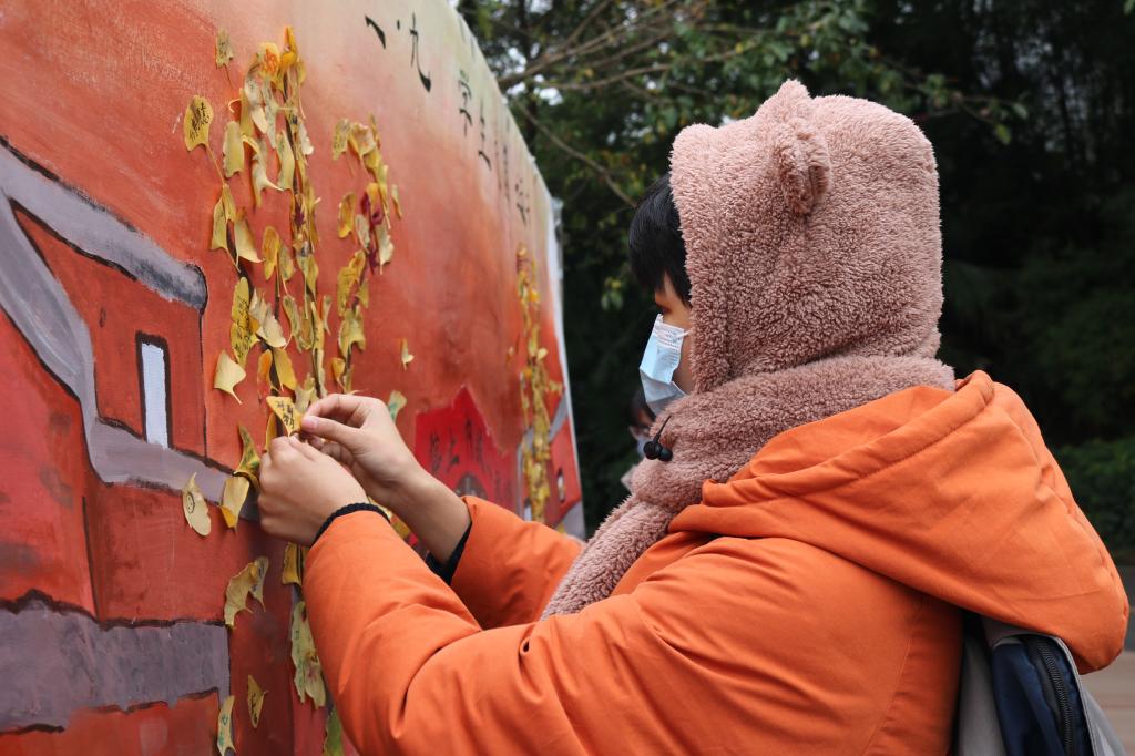 活动开始,同学们纷纷挑选一张好看的银杏叶,并发挥其想象力与创造力,用彩色笔在所挑选的银杏叶上自主作画或写上自己的梦想和对祖国的祝福。银杏叶上布满了“祖国加油”、“国家富强”和“我爱中国”等表达他们爱国之心的词语。随后,同学们将银杏叶沿着“树干”贴在了一幅写着“停止内战一致对外”的标语画布上,并欣赏了其他同学的作品。活动结束后,工程造价2019级张淇同学说到:“在参与活动的过程中,我感受到了身边浓烈的爱国主义氛围,而且意识到了作为新时代新青年我们应该增强自己的历史责任感与使命感。”