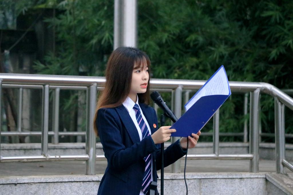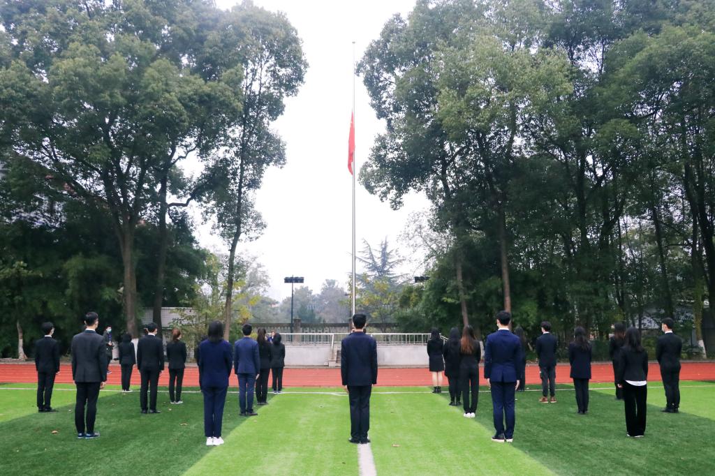 上午8点,所有参加人员集合完毕,在佩戴好团徽后,活动正式开始。训练有素的国旗护卫队走向升旗台,进行降半旗仪式,在庄严肃穆的气氛中,全体人员进行一分钟默哀。接下来,学生代表赵洁雅在国旗下的演讲重现了南京大屠杀的惨烈现状,令人痛心,同时也强调了要以国家大事为己任,实现小我,成就大我,深入贯彻习近平总书记:“无论过去、现在还是未来,中国青年始终是实现中华民族伟大复兴的先锋力量!”的思想。唯有青少年居安思危,努力实现中国梦,让祖国强大,才能不让历史重蹈覆辙。最后,主持人带领全体成员宣读和平宣言。