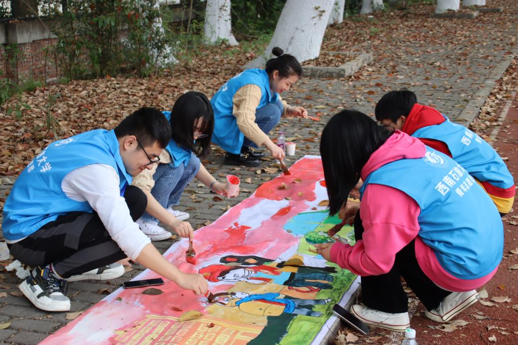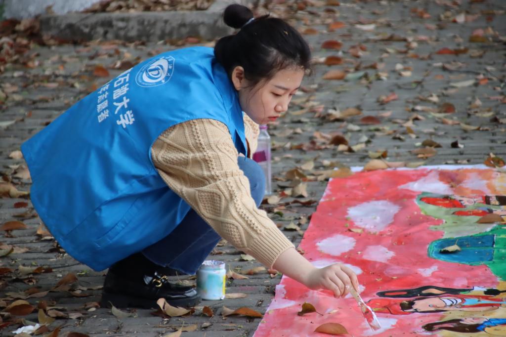 参与本次活动的志愿者分区域进行创作,在完成调色准备工作后开始为图画上色。活动过程中,志愿者在现场泼墨挥毫,细致描边,处理画作井井有条,他们全神贯注的模样感染了过往的同学,大家纷纷驻足观看。其中一位同学说道:“图上每一根线条都倾注了志愿者的心意,大家通过绘画的方式将志愿服务精神不断传递。”