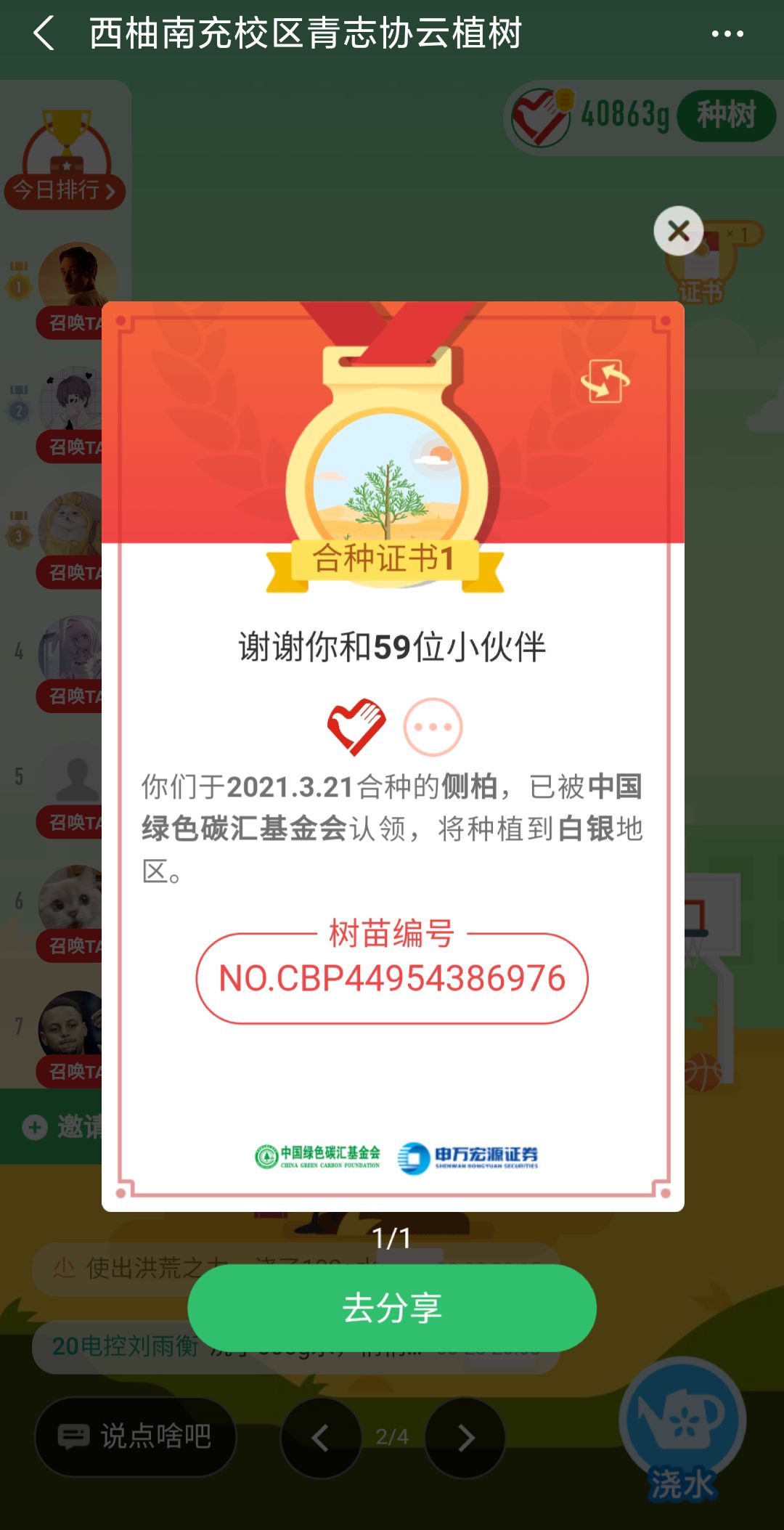 为积极响应国家环保政策号召,呼吁同学们践行低碳生活方式、增强其绿色环保意识,3月12日至4月12日,校区青年志愿者协会开展了以“云端植树绿意增,西柚志愿环保行”为主题的新概念云端植树活动。