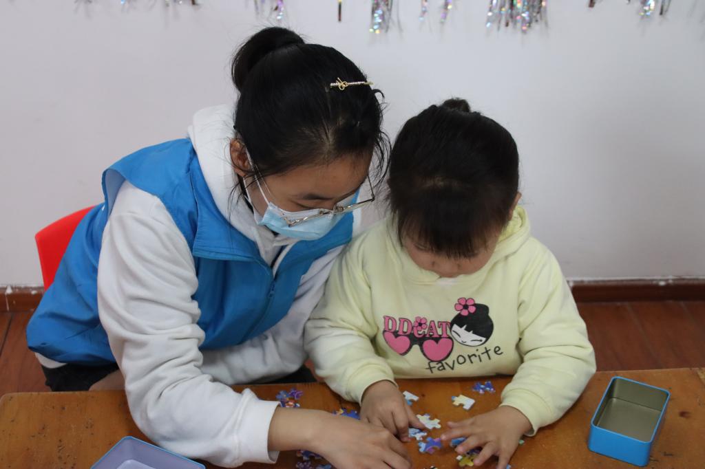 志愿者陪小朋友拼拼图