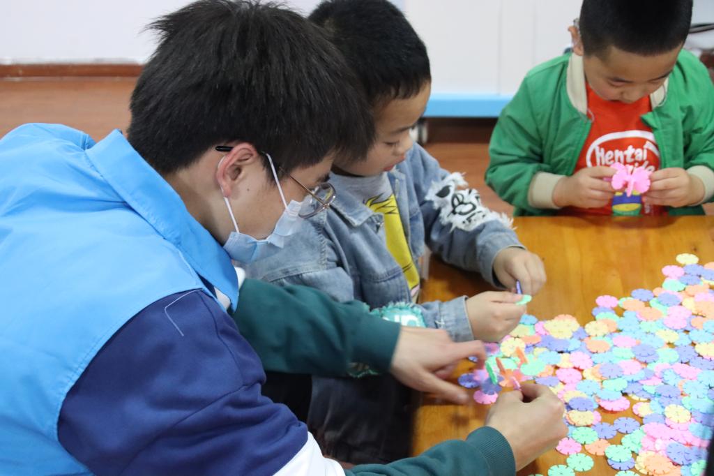 志愿者陪小朋友玩雪花片
