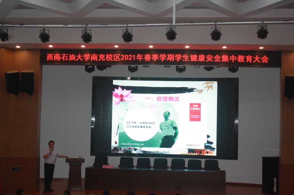 为了让学生在春夏交替之季有效预防传染病的发生,确保学生在校期间的健康安全。4月29日下午,校区学生工作部(团委)在国际学术报告厅举行南充校区2021年春季学期学生健康安全集中教育大会。此次活动邀请川北医学院周仲辉教授、四川省防艾专家何川教授、南充市四大队杨洋队长作为主讲人,主要介绍了传染病防治、艾滋病预防和校内外交通生活安全等方面的相关知识。