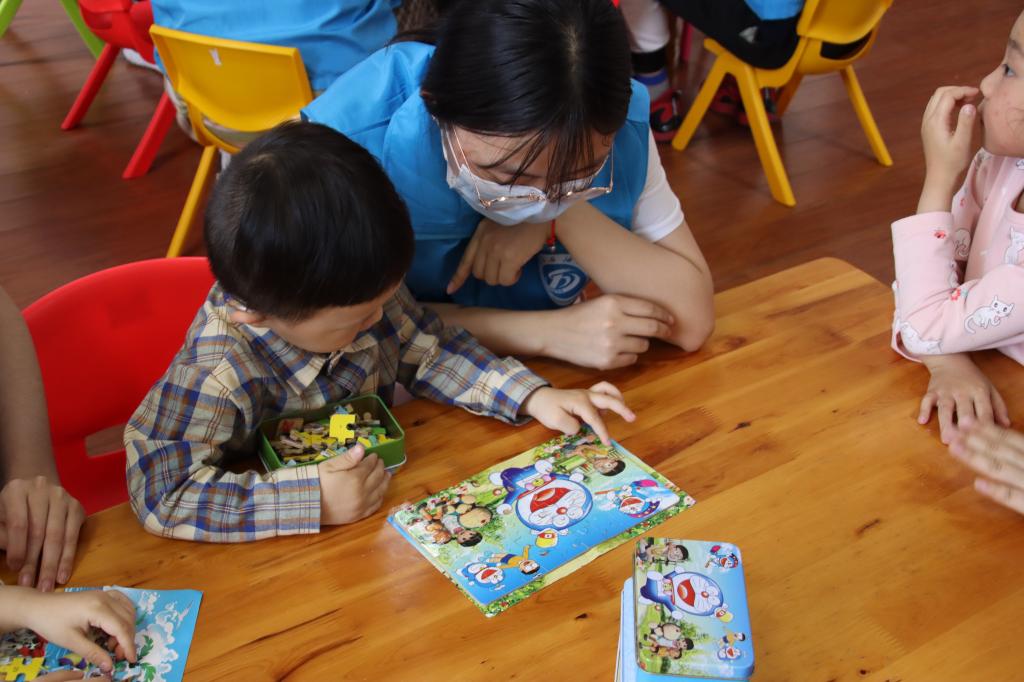 志愿者们抵达市残联后,带领孩子们一起完成教室布置,随即以一对一的形式开展志愿服务活动。孩子们与志愿者们一起进行了拼拼图、搭雪花片等生动有趣的益智游戏,拉近了志愿者与孩子们之间的距离,提升了孩子们的语言交流、大脑思维能力。之后,在志愿者的击鼓声中,孩子们进行了“抢椅子”的游戏。整个活动过程中,孩子们踊跃参与,积极互动,脸上洋溢着天真的笑容。活动结束后,孩子们与志愿者们挥手告别,并表示期待下一次的再见。