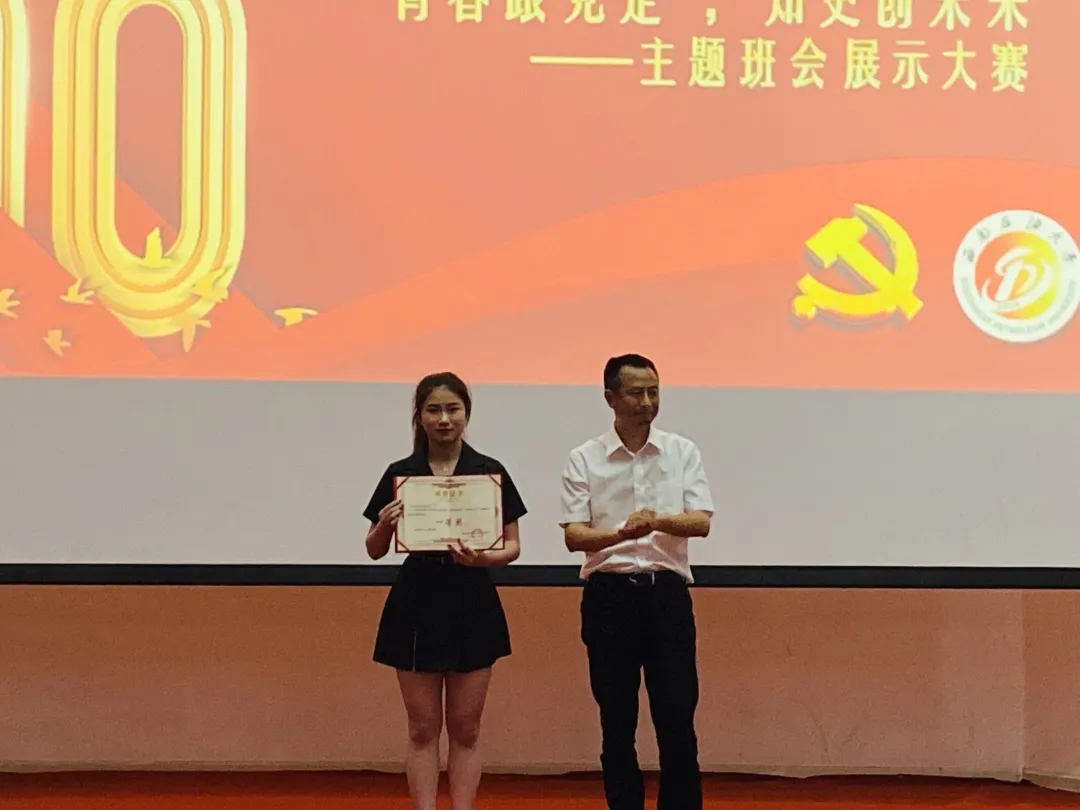 颁奖环节由主持人宣布西南石油大学南充校区"青春跟党走,知史创未来"主题班会展示大赛的最终结果:获得优胜奖的是:工程造价2020级1班,工程造价2020级4班,酒店管理2020级1班,电子与计算机工程2020级2班,信息管理与信息系统2019级3班。获得三等奖的是公共事业管理专业,获得二等奖是城乡规划专业,最终获得一等奖的是信息管理与信息系统专业。