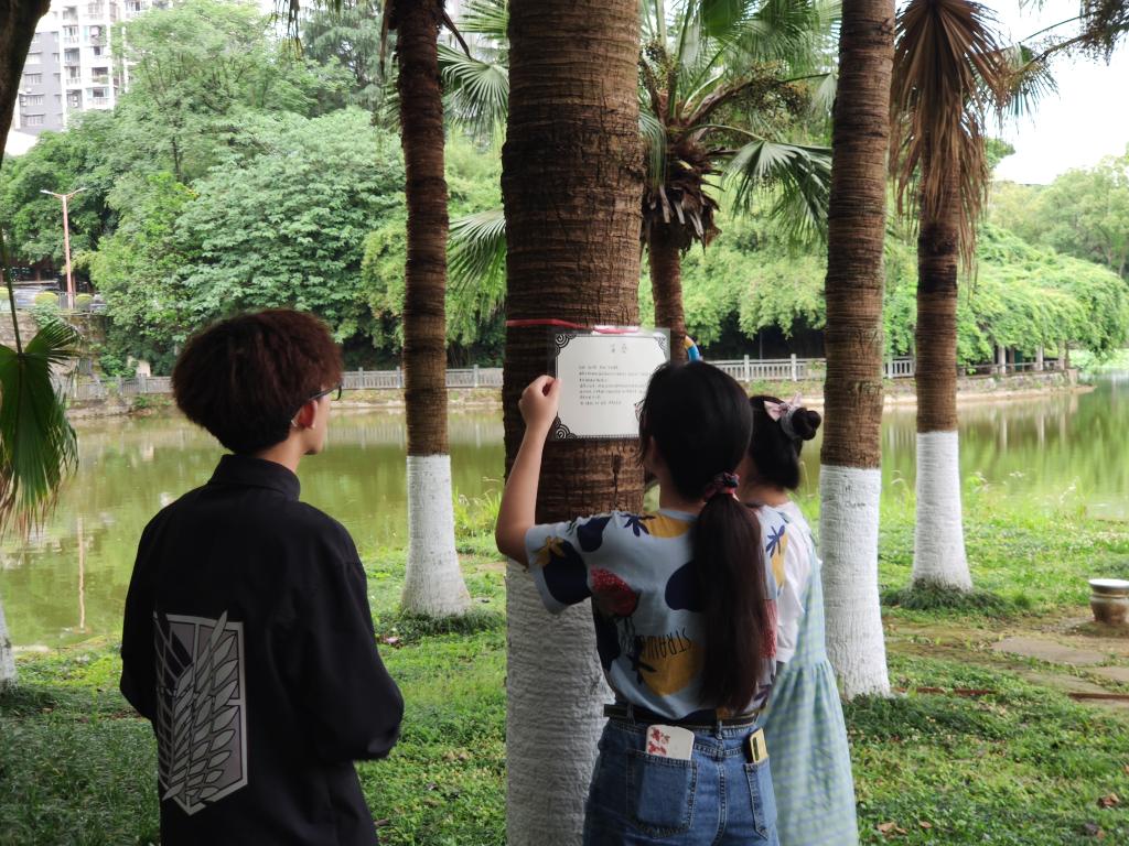 本次活动共分为两个部分。在第一部分的活动中,协会组织同学们分工进行树牌的制作与书写,为之后第二部分的活动做好了准备。之后,参加本次活动的同学在龙井湖观景台集合,并分为三个小组,分别为龙井湖周围的各类树木悬挂上专属的“身份牌”。