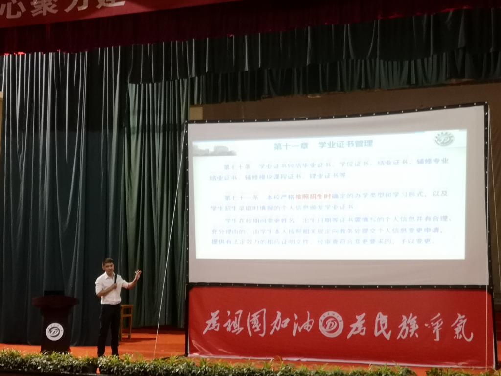 为让新生学习掌握学籍管理有关规定,9月10日上午,南充校区举办了新生学籍教育专题讲座。教务部学籍科副科长胡南担任主讲人,2019级全体新生参加了此次讲座。