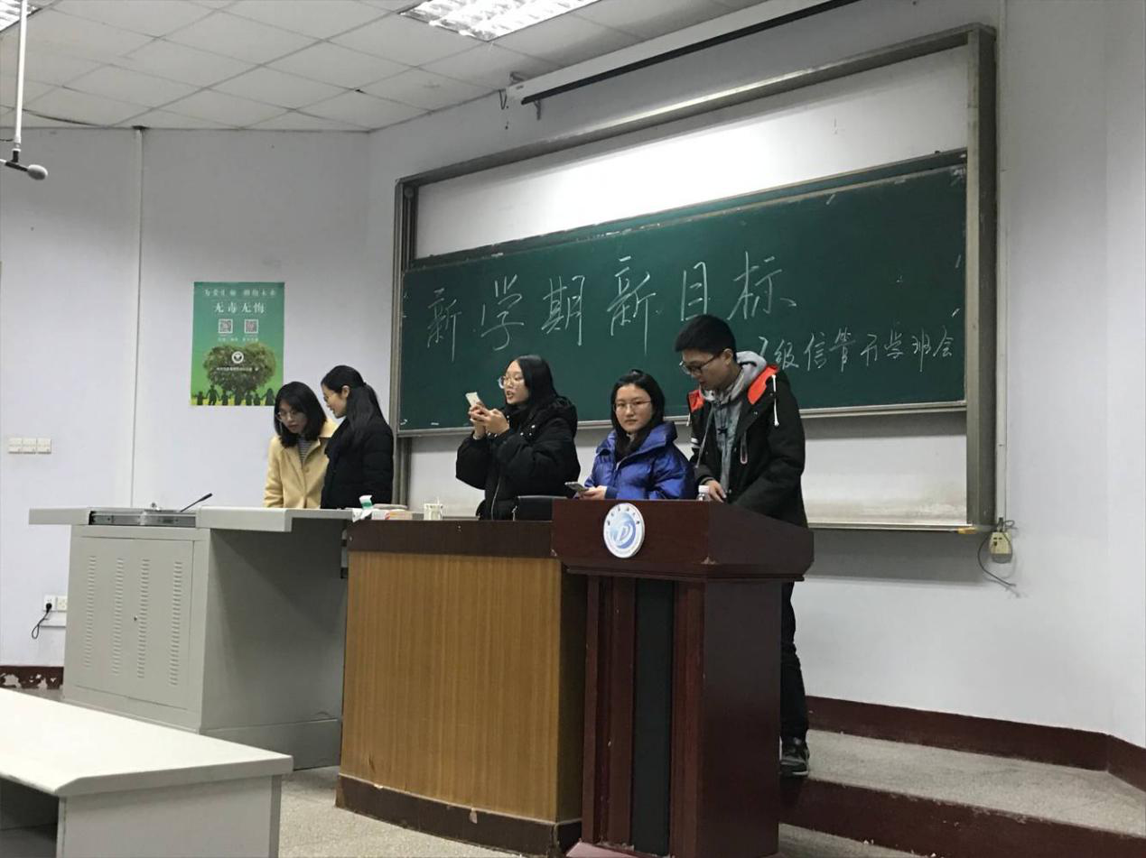 信息管理与信息系统专业2017级的班会以“新学期新目标”为主题。班委干部介绍了本学期班级工作计划,号召同学们要团结奋进,勤奋学习,新学期要展现新气象,努力实现新目标。
