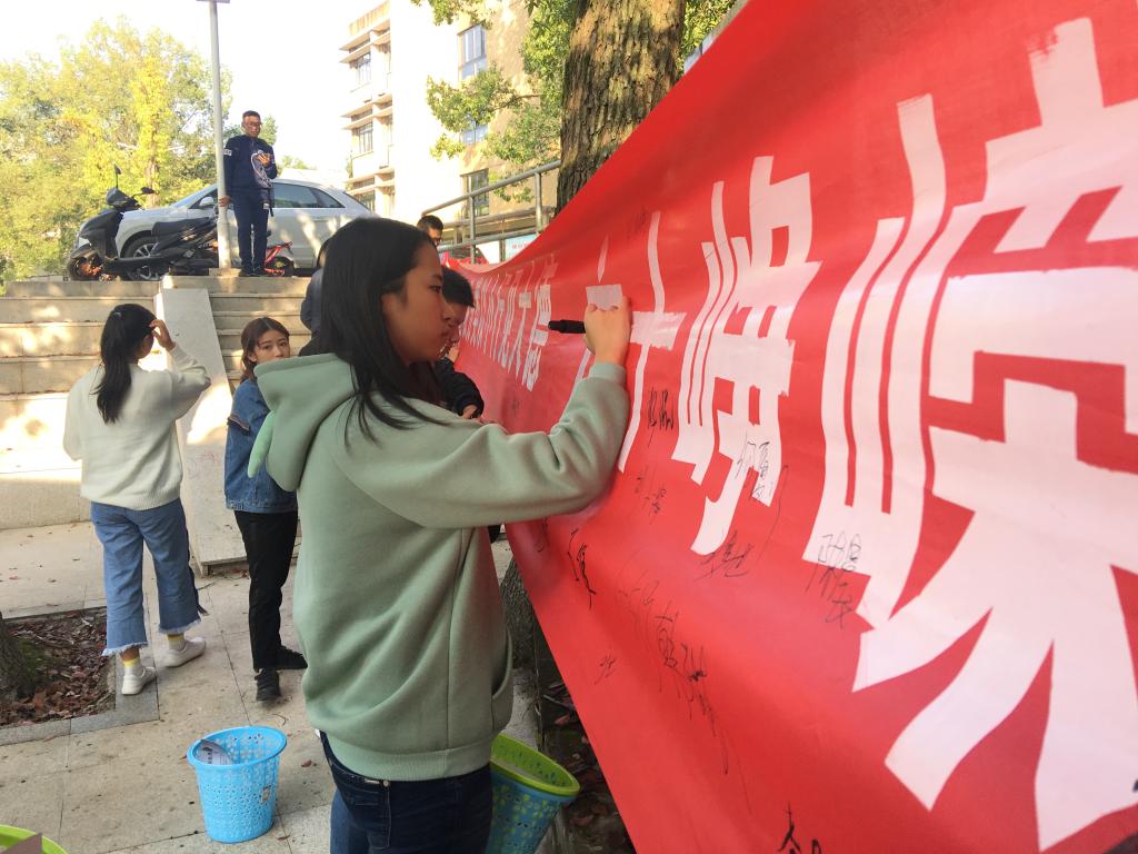 “垃圾分类以小行见大德,六十峥嵘度岁月展未来”。本次活动首先组织各室长及生活委员进行横幅签名并为各室长发放垃圾桶。随后开展了环保知识竞答和“抱团”游戏。竞答过程中同学们积极抢答,场面激烈,从众多同学中筛选出16名同学晋级到“抱团”游戏。由游戏产生最后的获胜者,为其颁发奖励。
