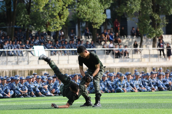 “杀!杀!杀!”的口号响彻足球场,承训部队教官为大家带来了精彩的队列表演和擒敌术表演。教官们个个精神抖擞,眼神里透露着坚毅,整齐的出拳、踢腿凌厉有力,彰显出军人的龙虎声威,表演博得阵阵掌声和喝彩。