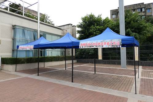校园服务中心积极开展迎新设施的搭建和配置工作,中心安排工作人员提前在体育馆内部和广场各处搭建了迎新接待设施,配置了必需的桌、椅、遮阳棚等物品,为院系和各职能部门接待新生报到、新生行李存放及家长亲友休息提供条件。体育馆内各专业新生报到注册点的电脑、验证身份证信息的读卡器、学生缴费的POSE机等设备已安装到位,调试完毕。