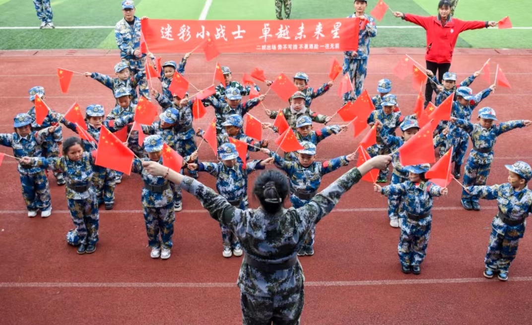 南充校区国旗护卫队迈着整齐划一的步伐护送国旗入场,全体人员肃立,升国旗、奏唱国歌、行注目礼,活动正式开始。家长和孩子们身着迷彩服,喊着响亮的口号,迈着矫健的步伐,昂首阔步地从主席台前一一列队走过。