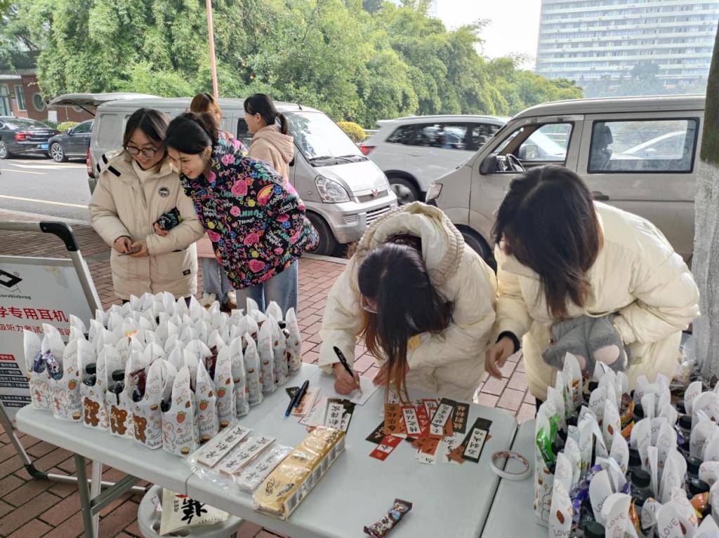 活动中,学府超市为考研学子们精心准备了礼包,内含零食饮料和文具等,分别蕴含着“纸”上青云、金“棒”题名等美好寓意。同学们领取礼包后,挑选了心仪的书签,写下了美好祝愿,并将书签贴在超市橱窗的“心愿祝福墙”上,以此来互相鼓励,传递信心。
