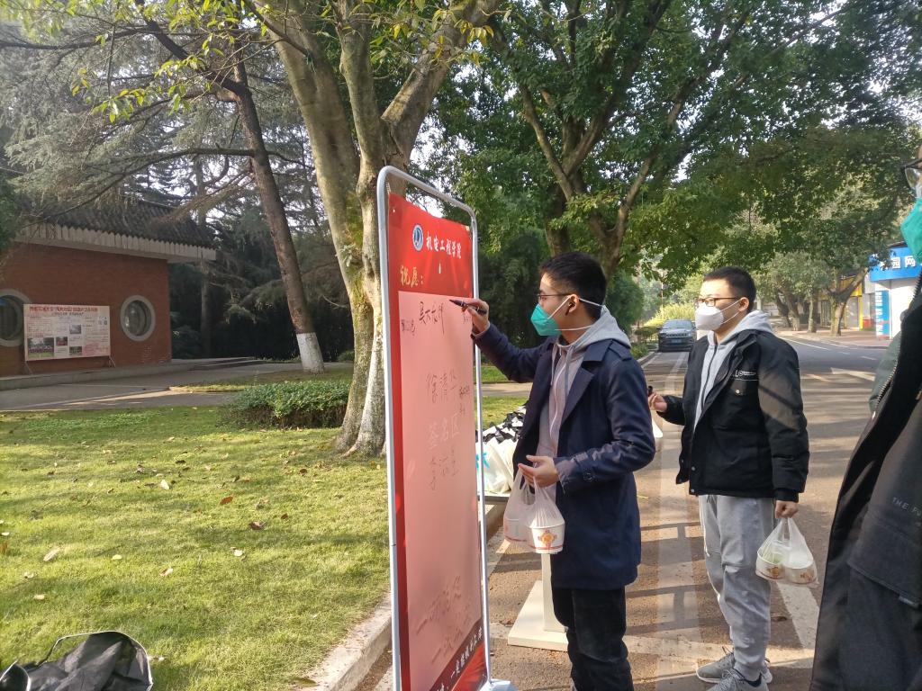 同学们领取“考研大礼包”后,纷纷在考研签名展板上写上了自己的名字,并与老师们合影留念,表达对学院、老师的感谢。(文/罗玉 李滋星 图/陈诺 罗玉)