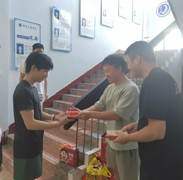 为进一步增强留校学生备考和备赛的信心,缓解同学们的压力,8月16日上午,机电工程学院辅导员苏国岿、王晓龙代表学院对学院留校学子进行慰问,并为同学们送上清凉饮品。