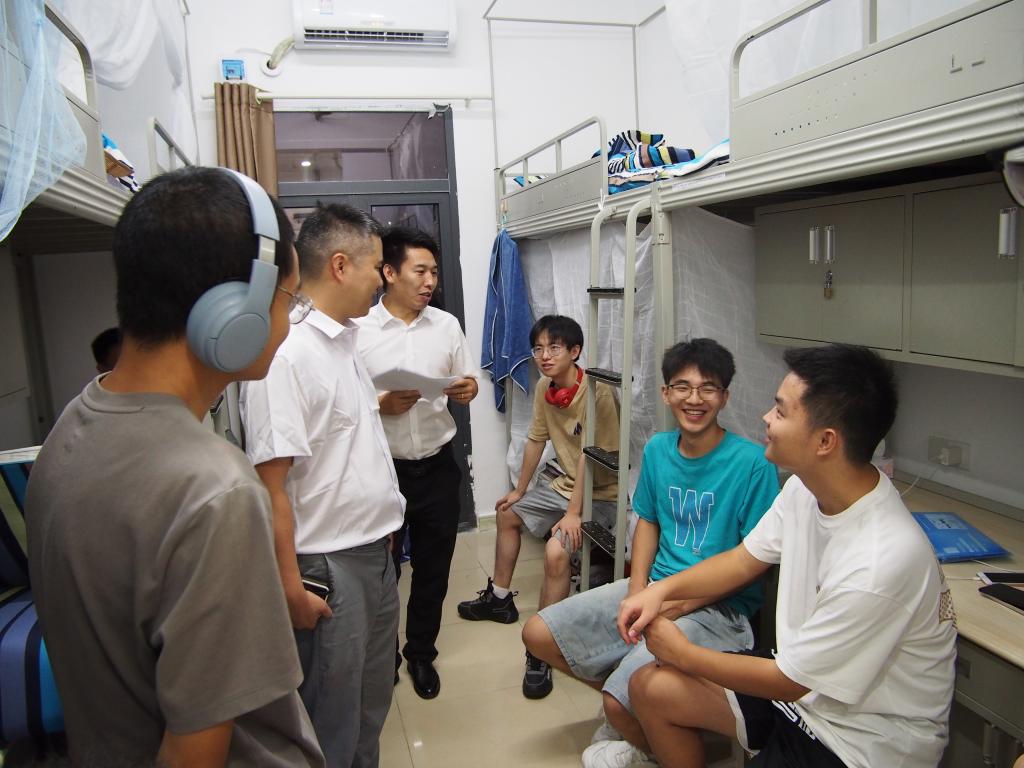 蔡灿一行带着满满的关怀与期望,走进了新生宿舍。蔡灿对新生们到校表示欢迎,并亲切地与新生们交谈,倾听新生们的心声,叮嘱大家注意防暑,学会管理时间,平衡学习与娱乐的关系,积极培养兴趣爱好,充实大学生活。同时,学院辅导员们也表示,学院将尽全力为同学们提供良好的学习和生活环境,鼓励大家遇到问题要及时提出,向学院寻求帮助。