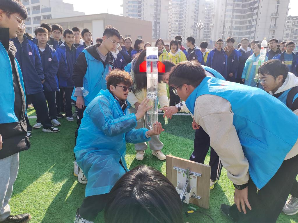 活动现场,机电工程学院“柚见蓝天”科普团队的师生展示了智能机器人、水火箭技术,进行了滑翔机和纸飞机等航模飞行表演,宣传了航模科普知识。团队成员操控机械狗展示了一系列萌趣动作,点燃了现场热烈的气氛,博得同学们阵阵喝彩。在水火箭技术展示环节,随着巨大压力的释放,水火箭如离弦之箭腾空而起,直冲云霄,现场学生惊叹不已。在航模飞行表演环节,团队成员展示了自制的各类航模,介绍了航模制作知识、操控技巧以及相关的物理、材料化学相关知识。滑翔机、F3P、纸飞机、TT 等各类航模在飞行手的精准操控下,于蓝天之上穿梭翱翔,时而攀升云端,时而俯冲掠地,其精彩绝伦的表演赢得了全场师生的热烈掌声与欢呼声。