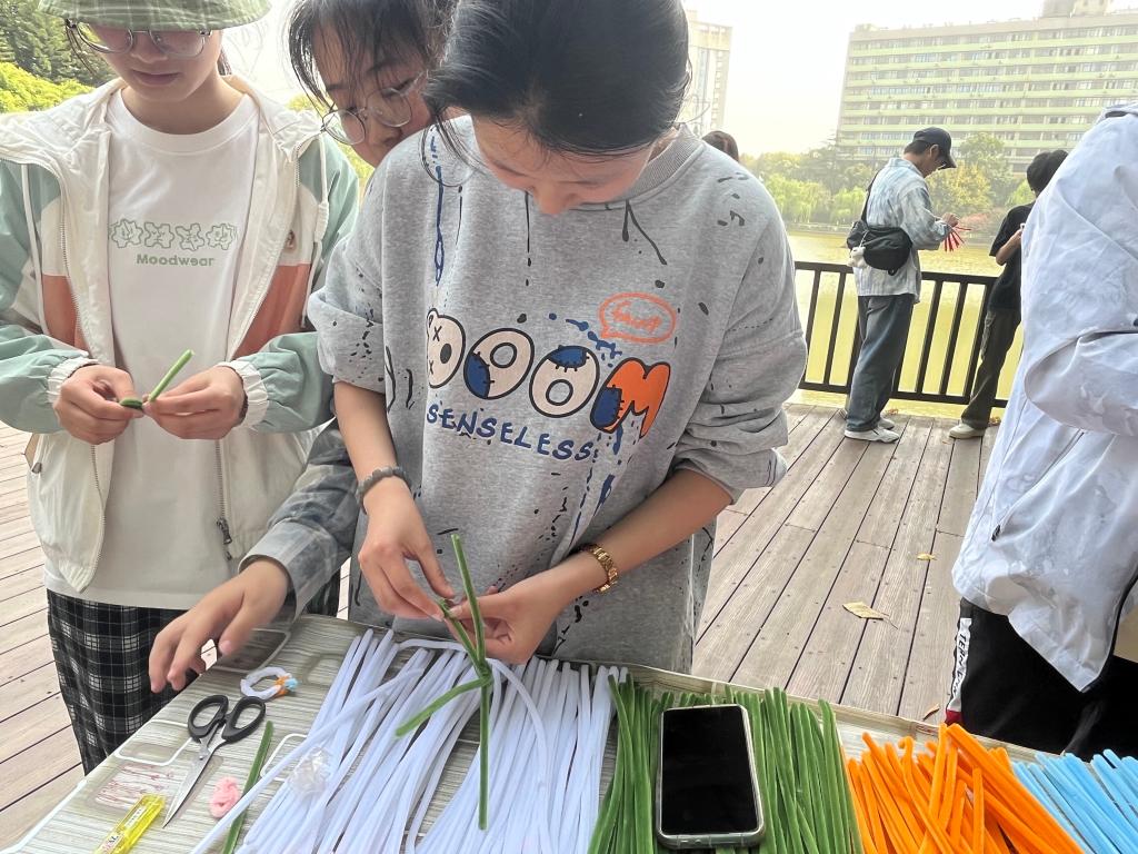 活动开始前,工作人员详细介绍了扭扭棒神奇的可塑性与丰富的色彩特性,耐心讲解了基本的制作技巧。讲解结束后,同学们便迫不及待地拿起扭扭棒,开启了属于自己的创意之旅,现场氛围轻松愉悦,同学们时而低声交流创作的灵感,时而相互分享制作的小窍门,大家沉浸在这充满创意与乐趣的手工世界中,暂时忘却了学业的压力和生活的烦恼,全身心地投入到这场与艺术和心灵的对话中。