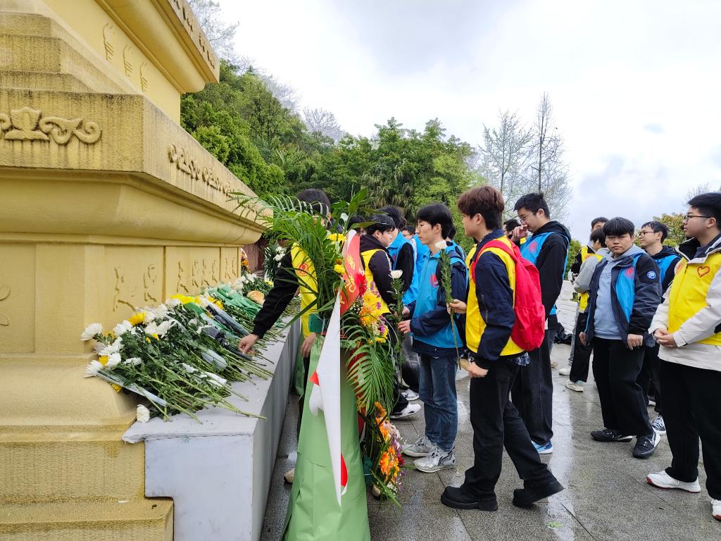学生干部代表深情诵读悼词,表达了对英烈的敬仰与追思。学生志愿者在老师带领下肃立于烈士纪念碑前,低头默哀,深切缅怀英勇献身的革命先烈。默哀毕,志愿者手捧白菊献于纪念碑前,全体人员行三鞠躬礼。在实践环节中,志愿者们分工协作,通过擦拭墓碑、绿化养护等行动表达对先烈的敬意。