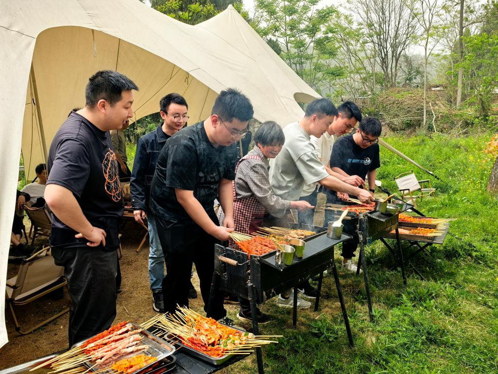 活动当天,七坪寨春意盎然。教职工们分组协作,在烧烤区架起炉灶,亲手烹制美食。炊烟袅袅中,大家分工有序,有人负责食材串制,有人专注火候把控,欢声笑语与食物的香气交织成趣。青年教师们主动承担起“主厨”任务,资深教授则化身“帮厨”传授经验,不同学科教师在协作中拉近距离,展现出课堂之外的别样风采。