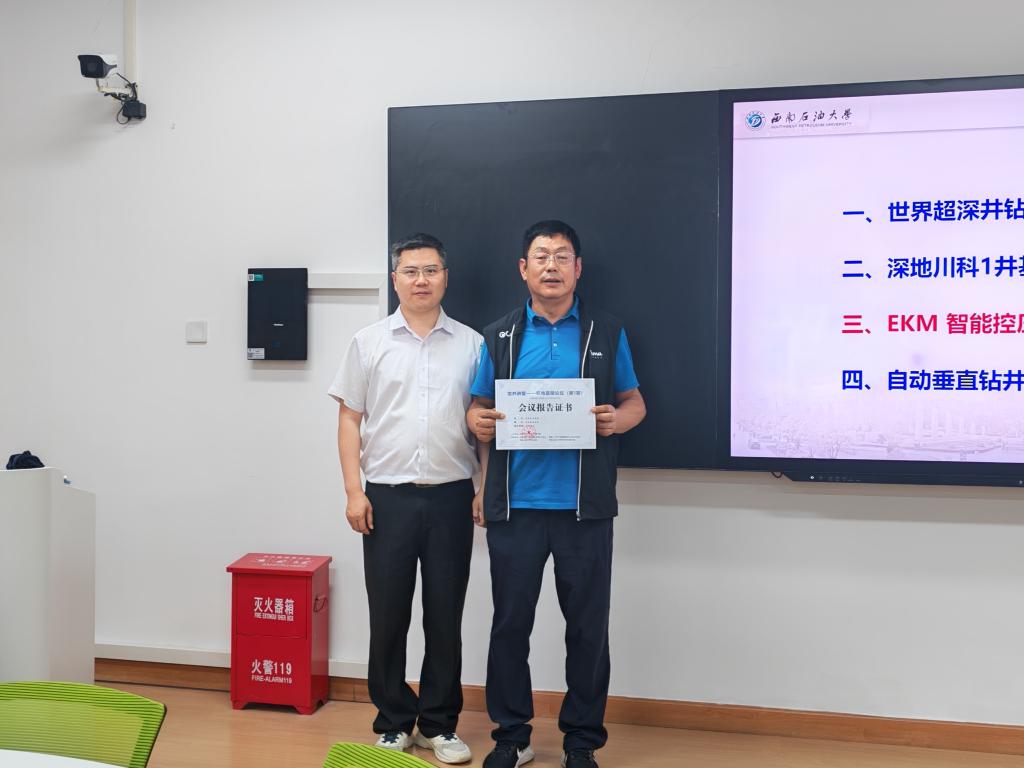 任涛教授以“从玩到学术研究-我的大学生活”为题,结合自身本硕博求学经历,分享了如何将兴趣转化为科研动力,并围绕管道机器人研发、学术成果转化等展开论述。作为西南石油大学首届“飞翔奖学术科技奖”获得者,他深耕油气智能装备领域,研发的管道机器人已广泛应用于多领域。聂荣国副教授则以“深地钻井技术”为核心,系统解析了复杂地层钻井技术难题及解决方案,其团队在柔性钻具组合强度分析等方面取得突破性成果,为深地工程安全高效作业提供了理论支撑。活动结束后,蔡灿代表学院为任涛教授和聂荣国副教授颁发了会议报告证书。