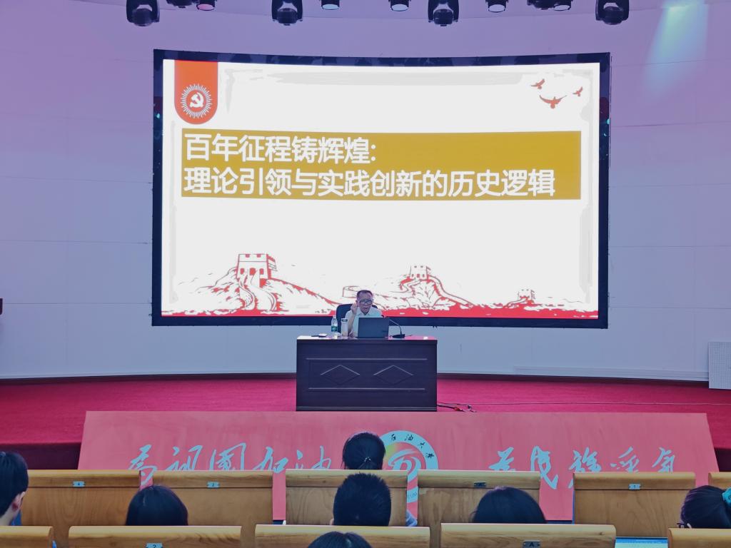 李华峰副教授首先运用详实的历史文献和鲜活的实践案例,论证了中国共产党在二十世纪初诞生的历史必然性,通过解析建党精神的核心要义,揭示了马克思主义政党坚守初心使命的理论源流。接着以“实现中华民族伟大复兴”为主线,梳理新民主主义革命、社会主义建设、改革开放和新时代四个历史阶段的标志性成就,结合“五个庄严宣告”的历史强音,展现党领导人民书写的壮丽史诗;深入阐释“九大法宝”的实践价值,系统解读新时代行动纲领的战略部署,为同学们提供方法论指导。最后李华峰副教授鼓励同学们要以史为鉴,从党的奋斗历程中汲取智慧力量,将个人理想熔铸于家国情怀,在求知探索中锤炼本领,在实践磨砺中坚守初心,让青春在实现中华民族伟大复兴的新征程上绽放绚丽之花!