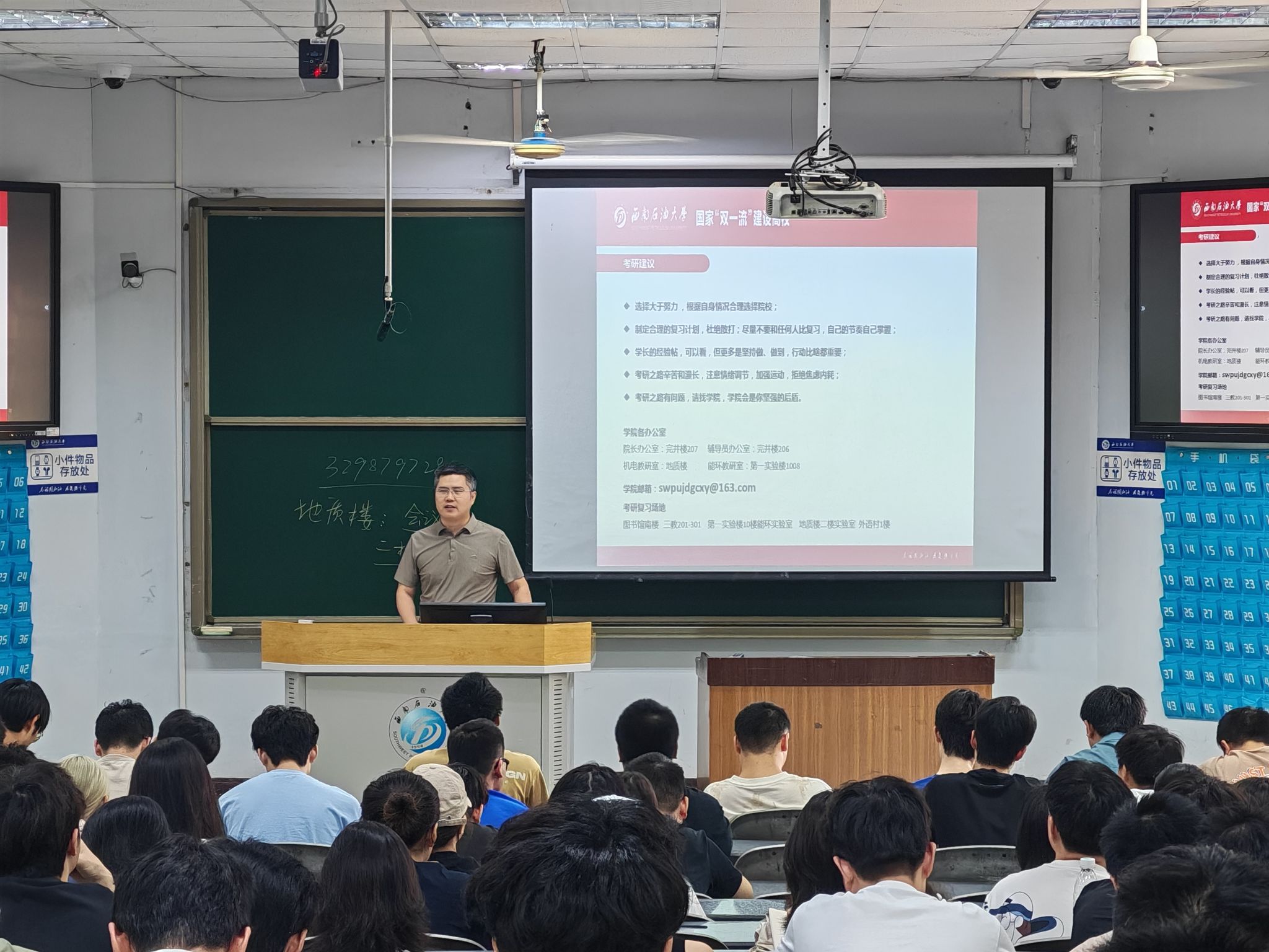 学院副院长蔡灿以学院近三年考研大数据为依托,通过报考人数曲线图、录取率波动趋势表等可视化呈现,详细地剖析了学院考研的整体态势。从国家战略需求、未来发展、报考流程、院校专业选择等方面详细解读考研意义和备考策略。蔡院长鼓励同学们树立坚定的信念,保持积极的心态,在考研的道路上勇往直前,并表示学院将整合学术资源、行业资源、校友资源,全力护航学子成功上岸。