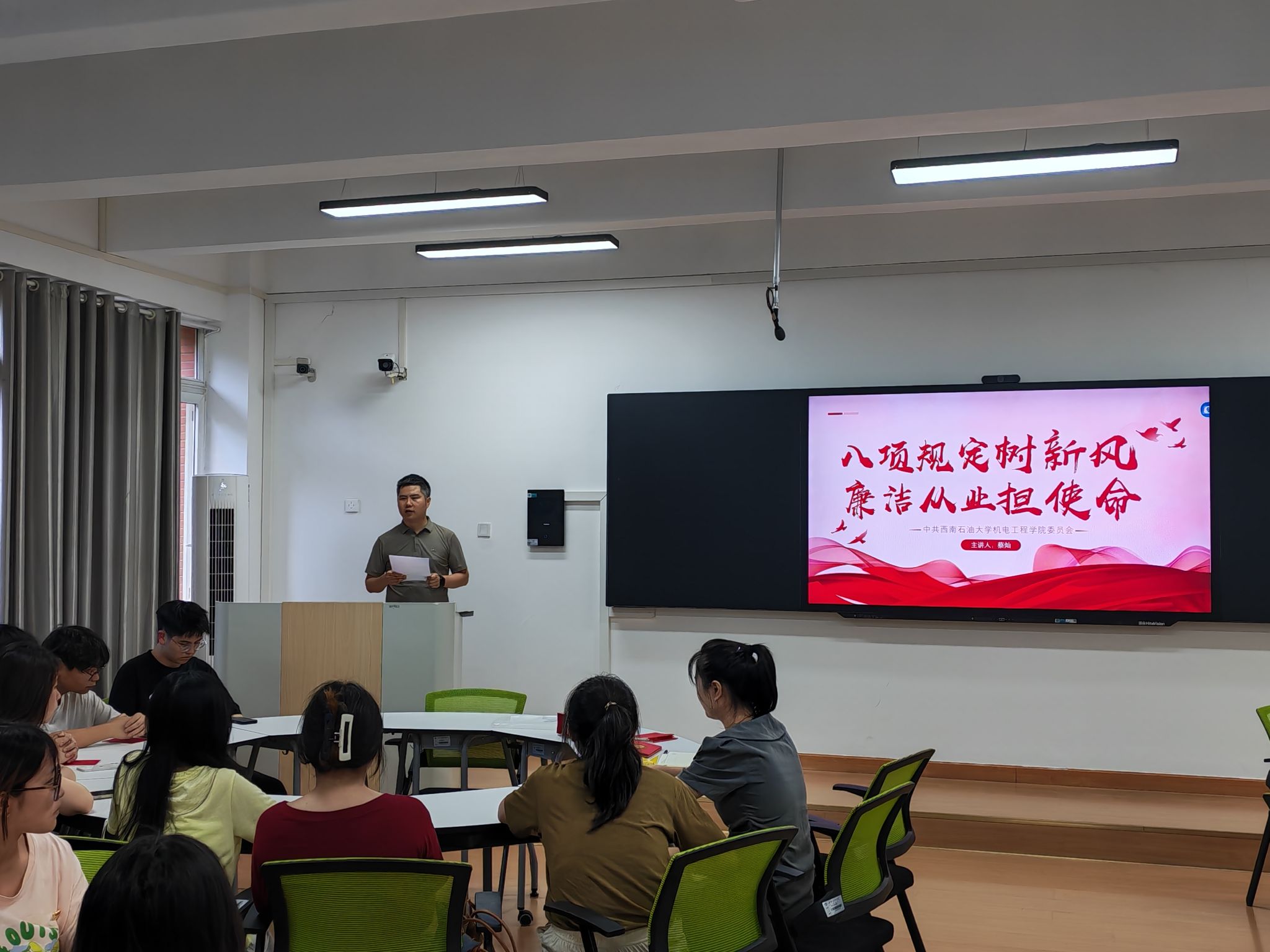 为加强学生党员队伍建设,提升学生党员党性修养与廉洁自律意识,6月12日,机电院学生党支部在第四教学楼4209教室举办新党员宣誓仪式暨毕业生党员廉洁教育。机电工程学院党委委员、副院长蔡灿参加活动。