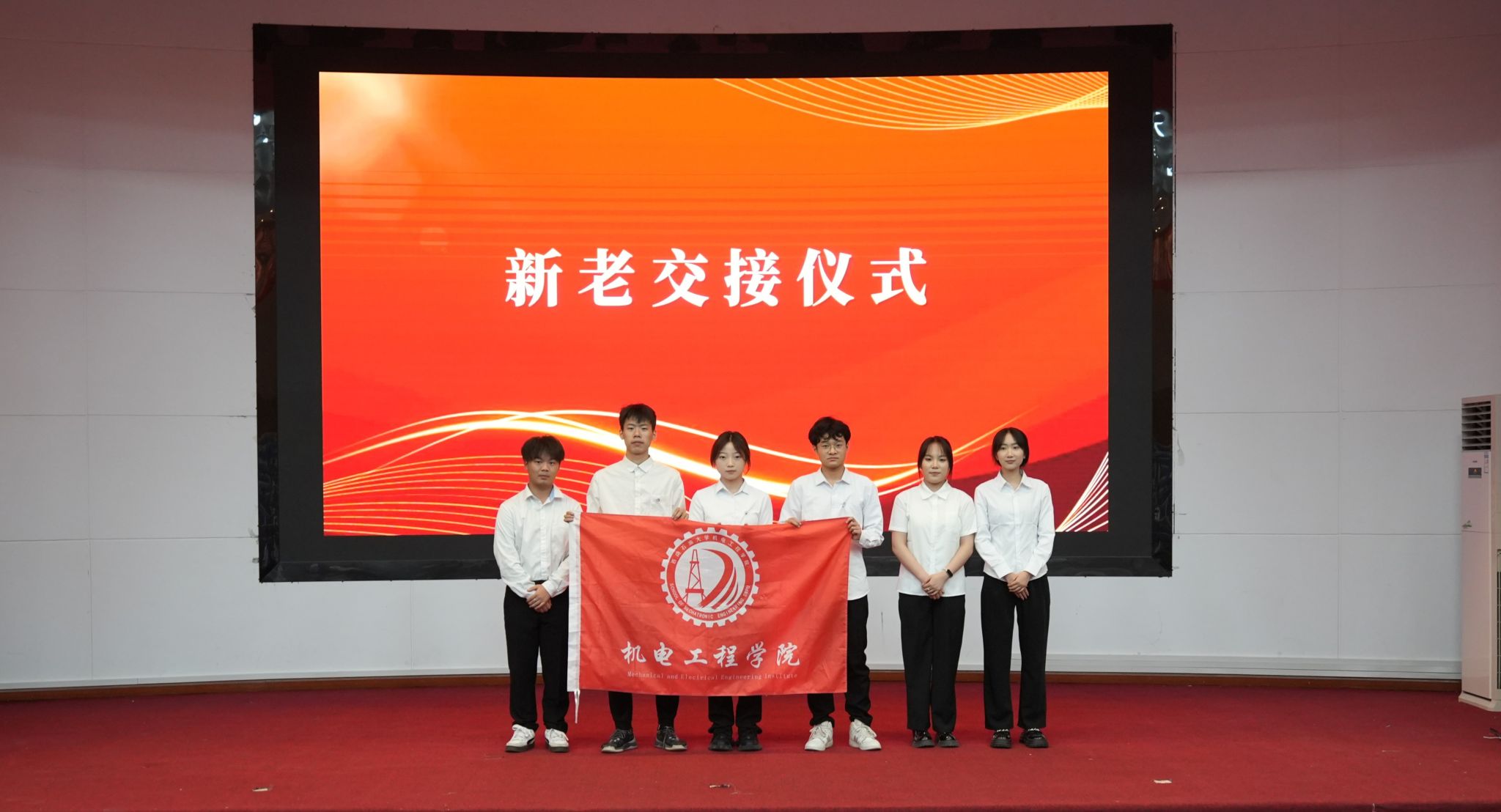 换届环节,许露之老师宣读新一届机电院团学工作中心干部名单,象征责任与精神的旗帜与徽章在新老成员手中郑重交接。