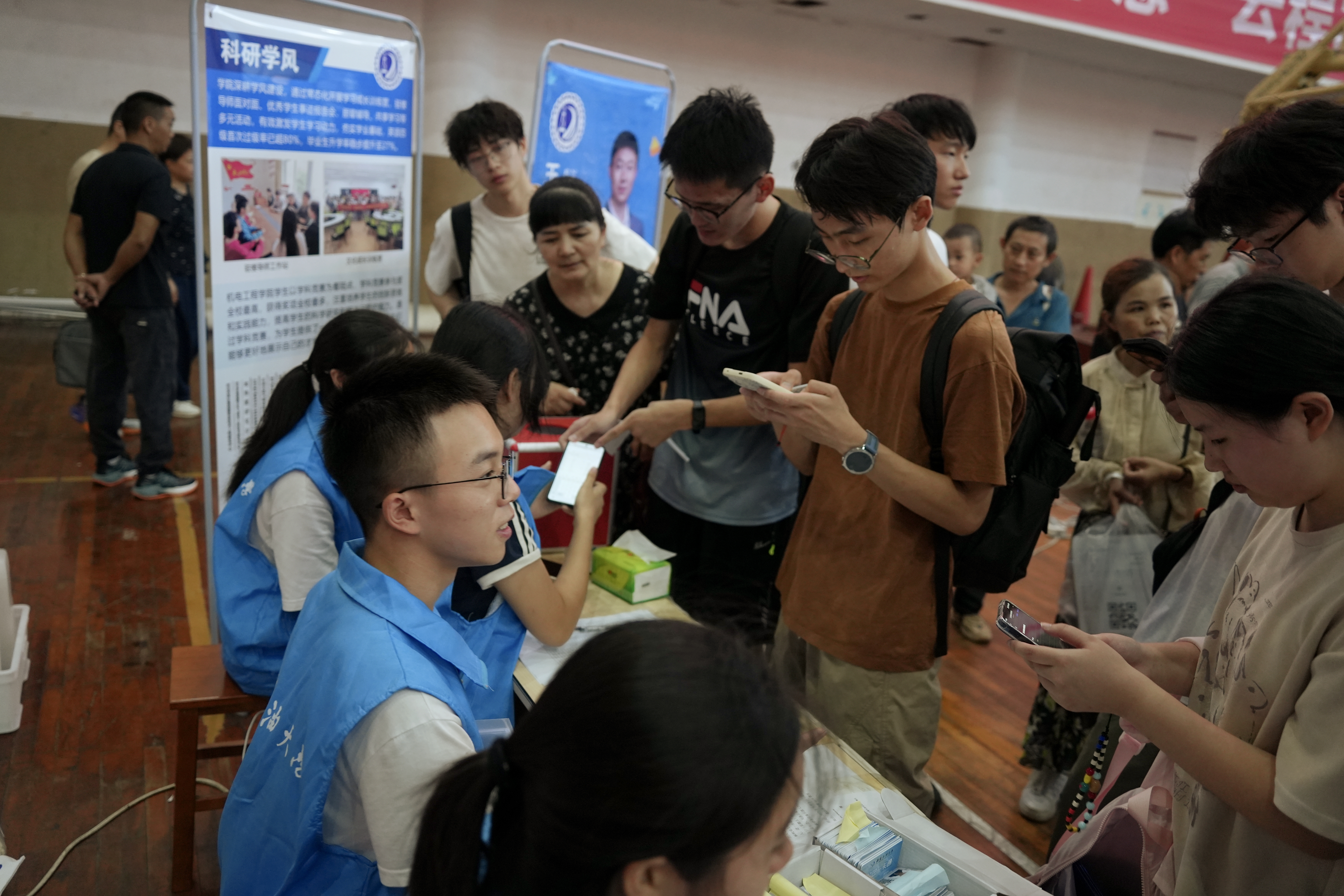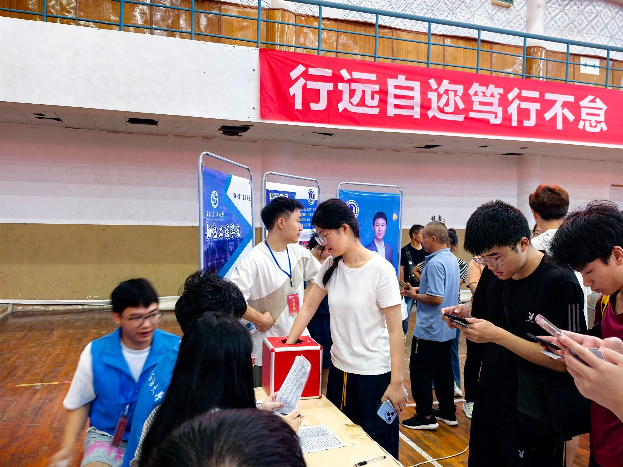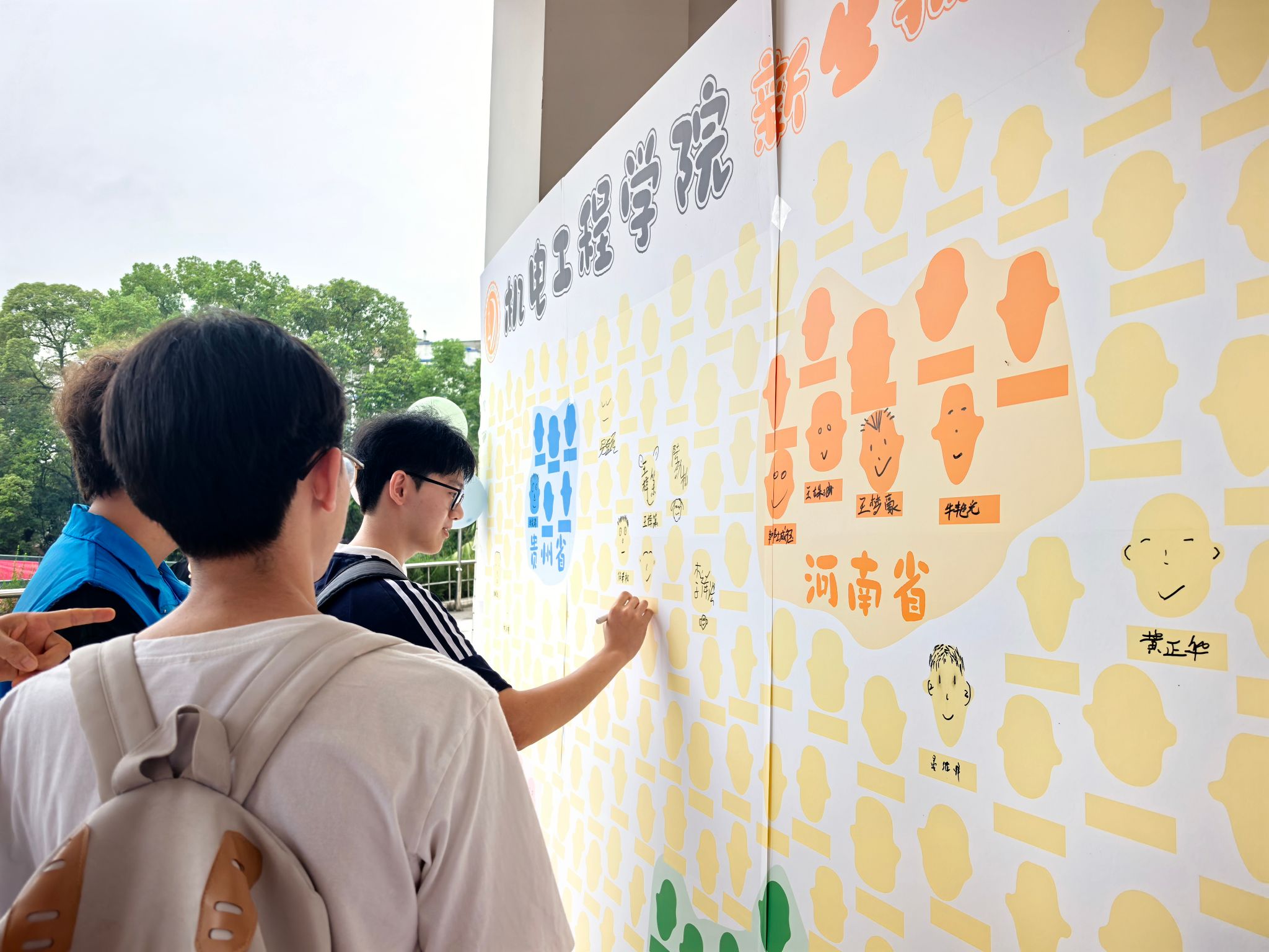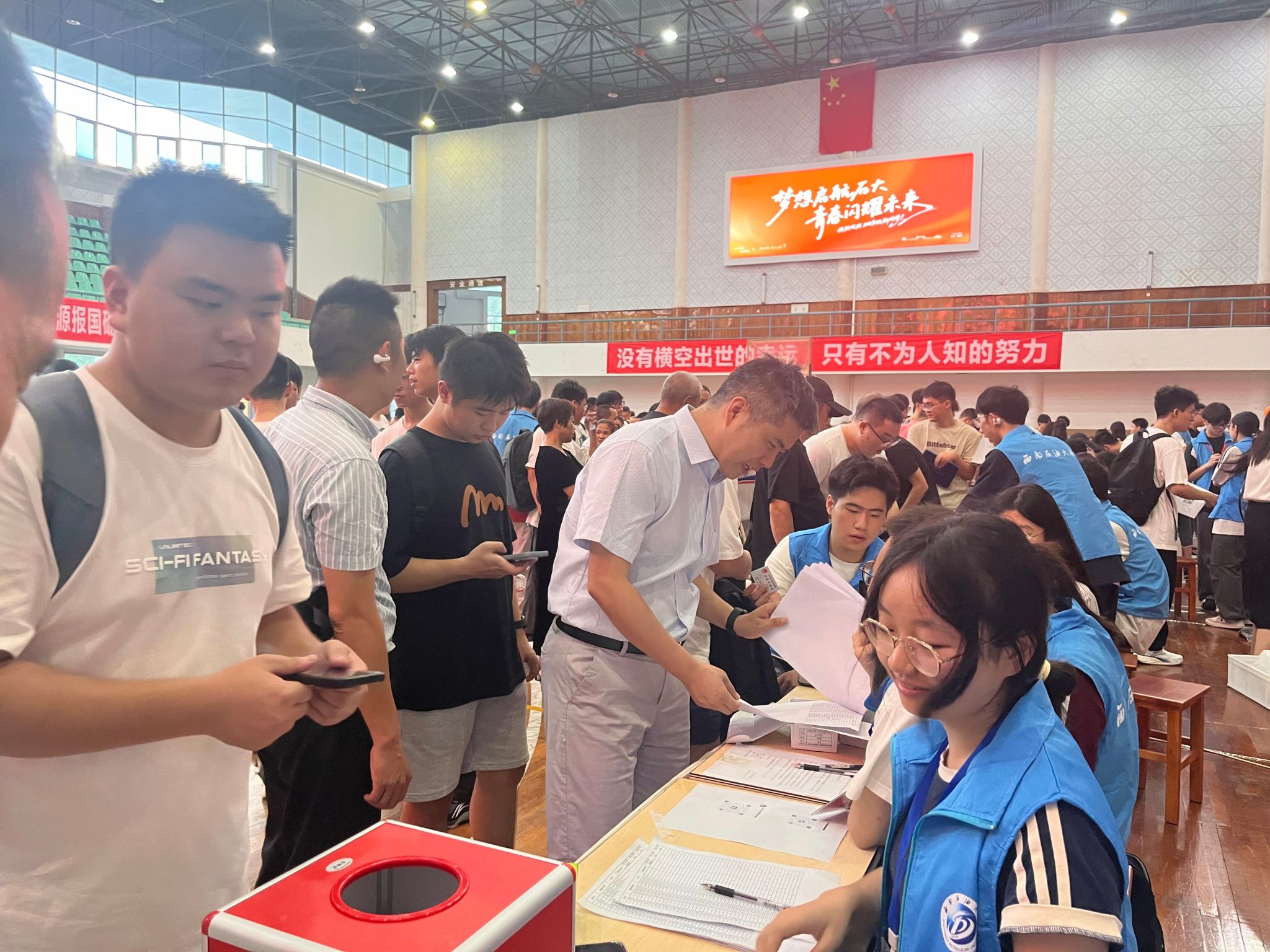 机电院在体育馆内设置新生报到处,组织志愿者团队协助新生完成身份核验、材料提交等流程;围绕新生关心的课程学习、生活须知等问题答疑;现场还准备了实用扇子和学院宣传册的迎新礼包,并设有抽奖环节,以轻松方式拉近彼此距离。此外,学院精心策划了多元迎新活动,设置多处打卡点,帮助新生快速融入校园。如体育馆“请留下你的笑脸”的鼓励新生通过自画像传递正能量;宿舍楼下的“请与我击掌”以跨越时空的击掌传递温暖与鼓励地质楼以“我在机电工程学院很想你”网络热梗标语,让新生直观感受实验室科创氛围。机电院副院长蔡灿亲临迎新现场,与学生及家长亲切交谈介绍学院概况和学习内容,鼓励同学们积极融入校园、适应大学生身份。
