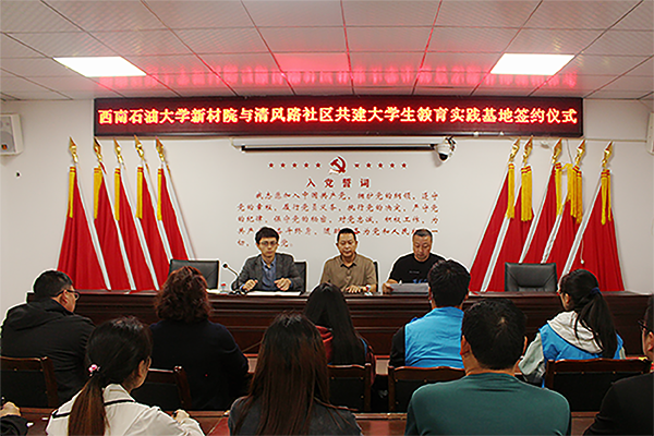 5月11日,新能源与材料学院和清风路社区举行共建劳动教育实践基地签约仪式。新能源与材料学院辅导员唐成玉,清风路社区党委第一书记罗润明、党委书记蒲明松和党委副书记陈红艳出席签约仪式。