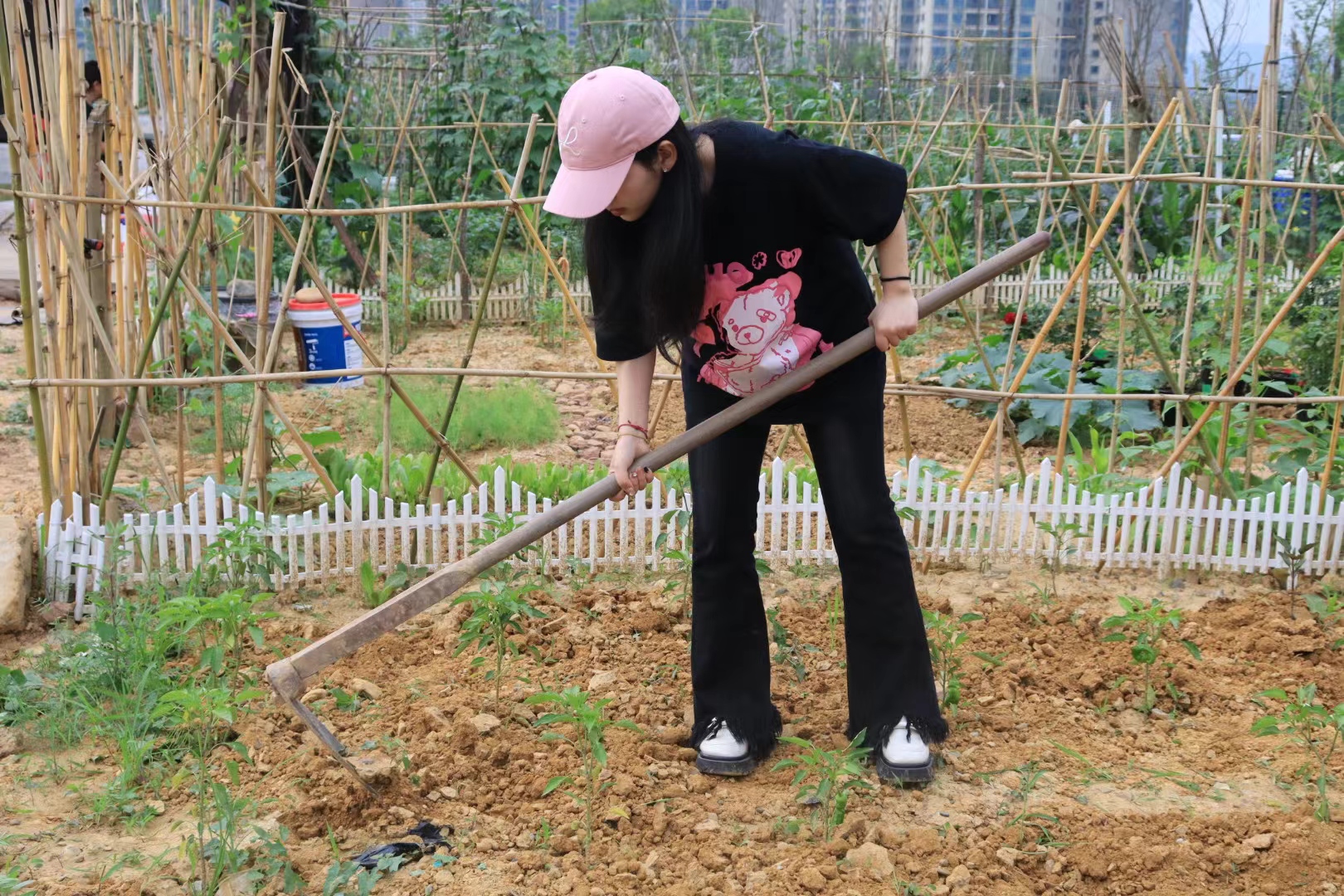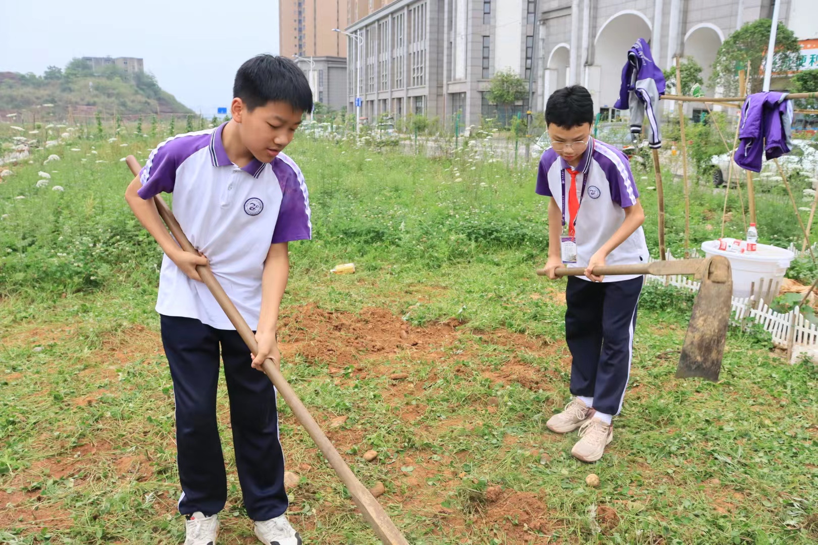 南充高级中学学生在支部党员指导后自行进行锄地
