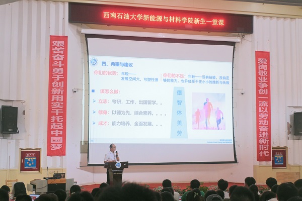 新生第一课上,武元鹏详细介绍了学院的历史和现状,通过生动的案例和最新的行业动态重点讲解了新能源与材料领域的前沿技术和研究方向。他展示了学院近年来在新能源技术、材料科学等方面取得的研究成果和应用实例。鼓励新生们在未来的学习和生活中,充分利用学院提供的各种资源,保持好奇心和学习热情,并以积极的态度面对挑战和机遇,在大学生活中取得优异的成绩,为未来的职业发展奠定坚实的基础。