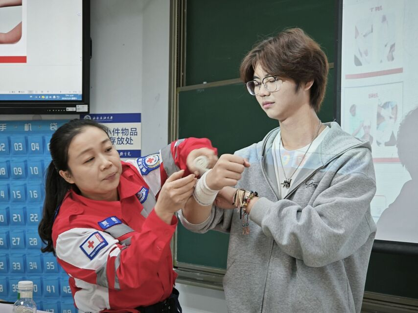 在为期一天的培训中,红十字工作人员深入讲解了心肺复苏、海姆立克急救法、止血包扎以及骨折固定等关键急救知识,并现场演示了心肺复苏、骨折固定和创口包扎的操作流程。培训过程中同学们踊跃参与,认真学习,经过不断地操作练习,最终以出色的表现通过了应急培训考核。