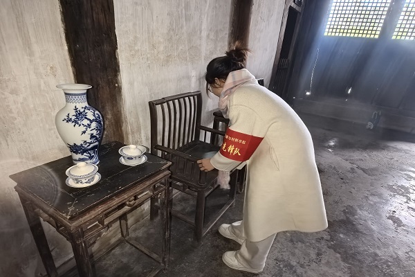 党员同志擦拭故居椅子