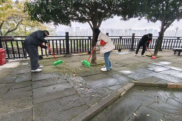 党员同志清扫地面