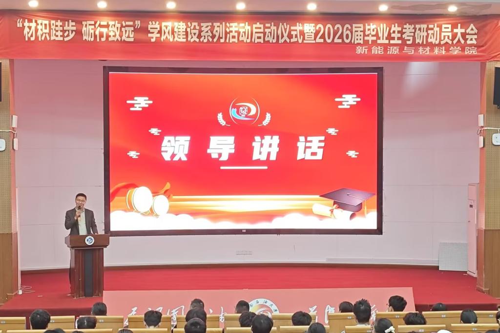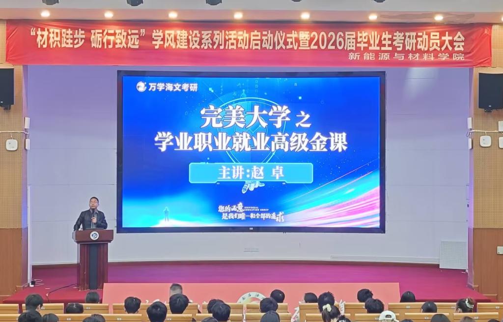 为深化学风建设内涵,激发学生考研内生动力,4月24日,新材院在国际学术交流中心举行“材积跬步,励行致远”的学风建设系列活动启动仪式暨2026届考研动员大会。学院副院长周培山,万学海文考研辅导老师赵卓,学院学生工作办公室(团总支)和相关专业教师、辅导员、2026届考研学生齐聚一堂,共话学风建设与升学规划。