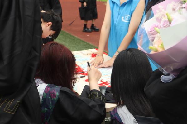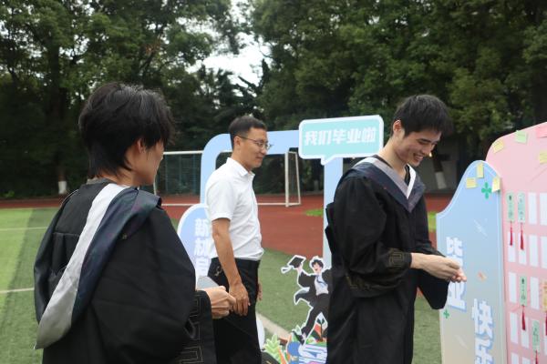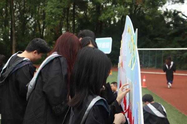 活动现场,融合了学院特色与毕业主题的打卡板吸引了毕业生们驻足。毕业生们手持签字笔,带着满满的热情和对未来的憧憬,认真在打卡板前写下自己的祝福。“前程似锦”“感恩母校培育,愿西南石大越来越好”等真挚话语布满打卡板,每一句都承载着毕业生们对自己未来的美好规划和对母校的感恩之情。打卡过程中,毕业生们三两成群穿着学士服,在打卡板前摆出各种创意姿势,用相机定格这一难忘瞬间。活动结束后,两块承载着满满祝福的打卡板被移至龙井湖畔。打卡板在这里继续向过往的师生展示着毕业生们的心声,延续着这份温暖。
