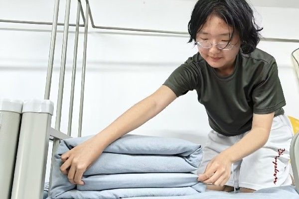 本次活动分为初赛和决赛两个阶段,9月22日经线上初赛评选后,成功晋级的同学9月27日在各自寝室进行线下决赛。决赛现场,选手们动作娴熟,从铺平被面到折叠边角,动作一气呵成。活动最后,工作人员依据被型规整度、叠被速度等多方面参考打分,评选出最优秀的“叠被能手”。
