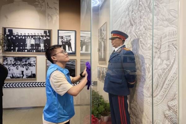 活动中,志愿者被分为三个小组,分别负责展厅、庭院和办公区域的清洁工作。志愿者们认真擦拭展柜,清理地面,不放过任何一个角落;清扫之余,志愿者们还向参观故居的游客讲解将军事迹与革命故事,传递革命精神,弘扬红色文化。
