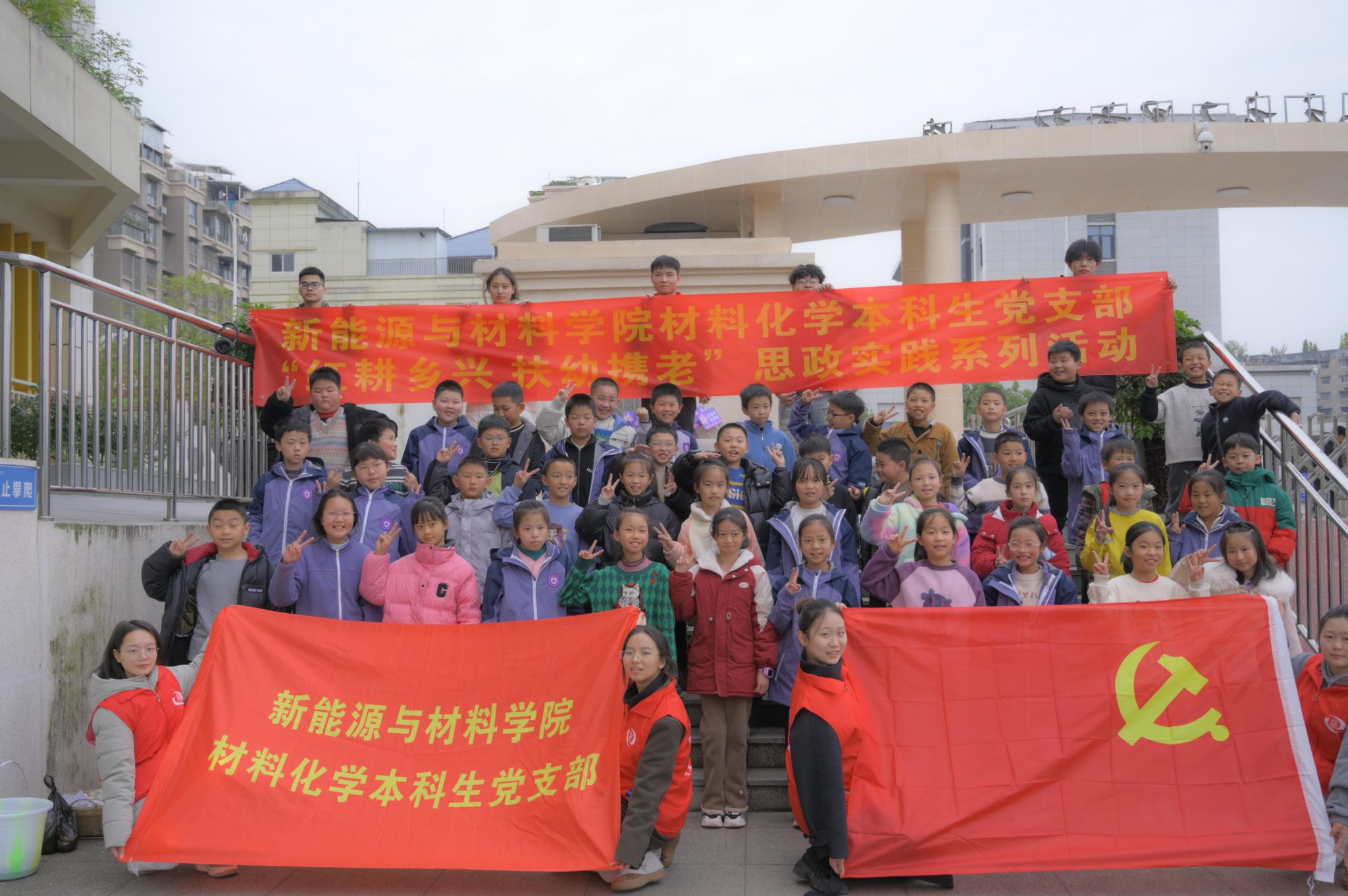 学生志愿者、学生党员与小朋友合影