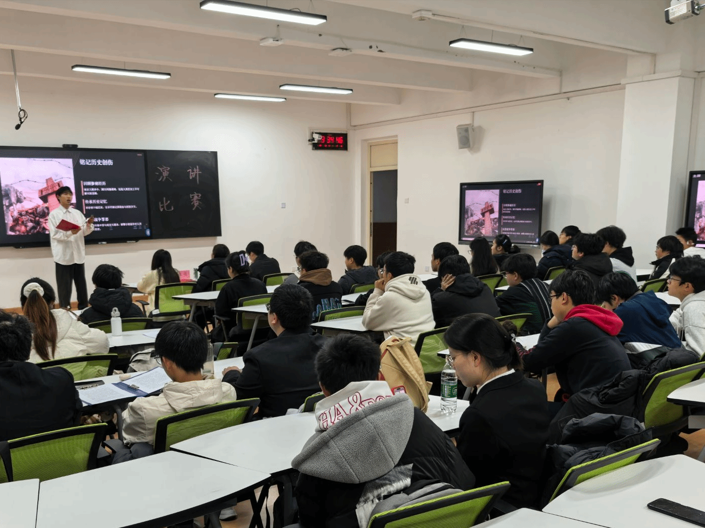 比赛现场,选手们紧扣“铭记历史、砥砺前行”的主题,结合个人学习与生活体会,以平实的语言回顾了中华民族近代以来的艰辛历程与奋斗足迹,并分享了对历史事件的理解与感悟。从老一辈革命先烈们的抗战故事,到如今国泰民安时人们对和平的珍视,真挚的情感深深感染了现场观众,教室里不时响起热烈的掌声。