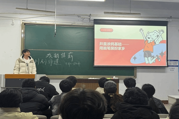 活动伊始,主讲人从川剧的起源讲起,系统阐释了川剧服饰的色彩寓意、纹样象征及面具在角色塑造与情感表达中的独特文化内涵与舞台功用,随后,主讲人结合近年来优秀的舞台创新与文创产品等实例,生动展示了传统川剧元素与现代艺术设计的巧妙融合,引导同学们思考传统文化如何基于现代环境完成传承与创新。活动现场互动积极,交流气氛浓厚。