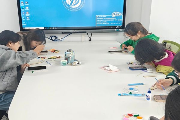活动伊始,工作人员详细介绍了丙烯颜料的调色技巧、手工白胶的使用方法及书签设计的创意思路,展示了多款风格迥异的优秀作品作为参考,并发布视频教程。随后同学们迅速投入创作,剪裁卡片、调配色彩、勾勒图案,同学们或以文学名句为灵感书写箴言,或融入校园景致与自然风光勾勒图景,还有同学巧用拼贴、晕染等技法打造立体视觉层次,尽显创意巧思。创作过程中,大家相互交流技巧、分享创意,在协作探讨中完善作品,普通白卡逐渐化为独具匠心的艺术书签。