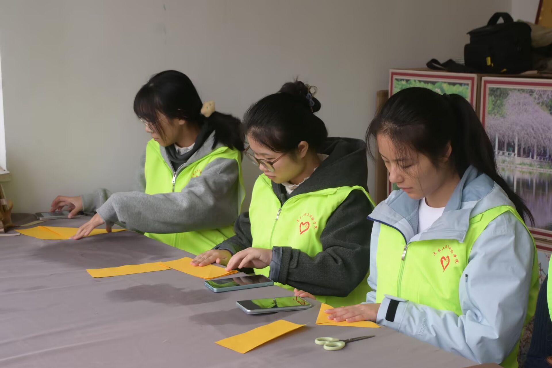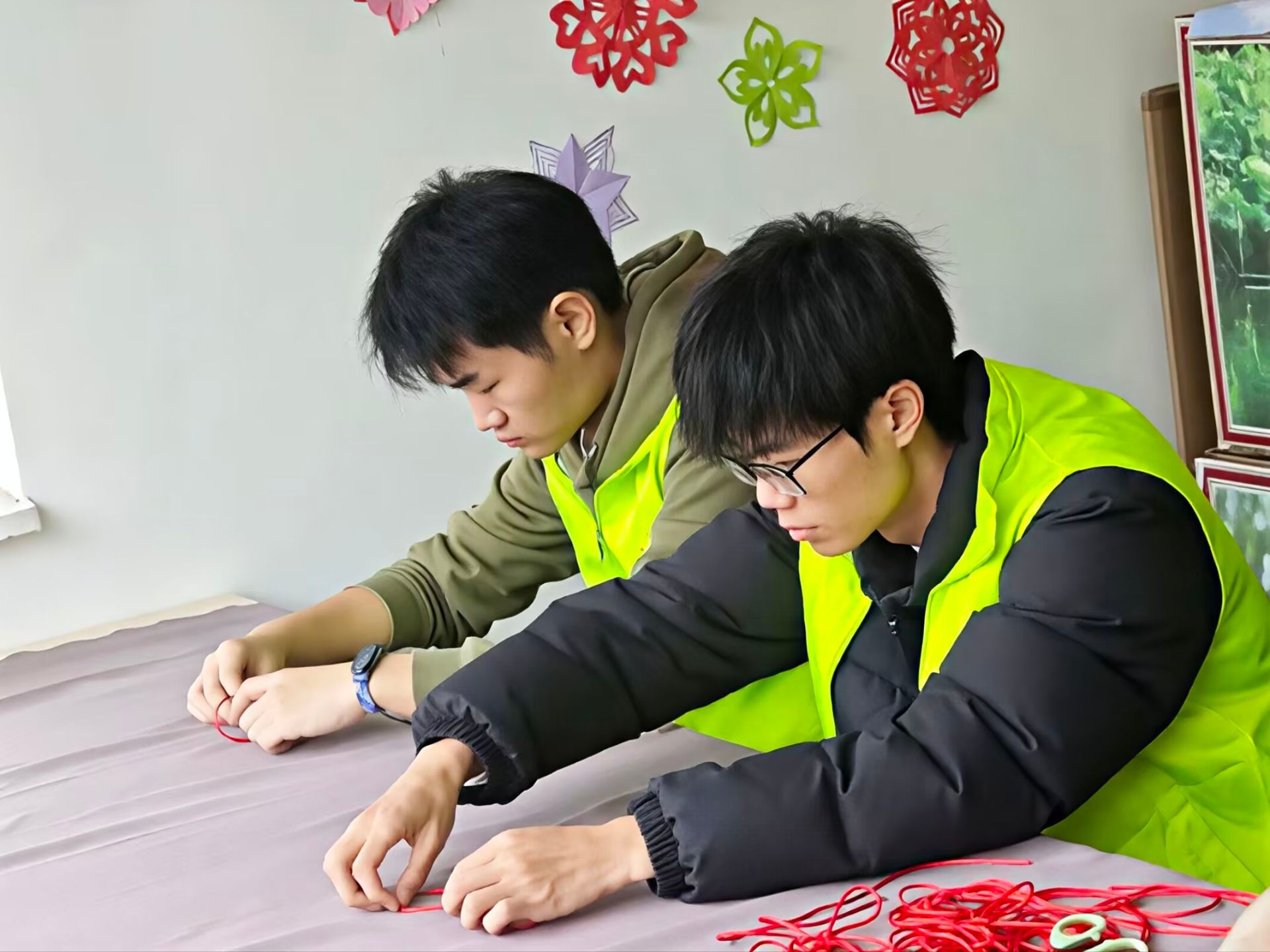 活动期间,同学们分组参与了三类传统技艺的深度体验。第一类是剪纸创作体验,以卡纸为载体、剪刀为工具,将祥云、花鸟等吉祥元素巧妙融入设计,裁制出寓意美好的精美作品;第二类为中国结与折纸体验,红绳交织成象征团圆的吉祥结,千纸鹤、蝴蝶等折纸作品灵动别致,尽显手工巧思;第三类是扎染实践,同学们亲手捆扎布料、精准调配染料,让色彩在织物上自然晕染出独特纹理,充分展现传统工艺的匠心之美。