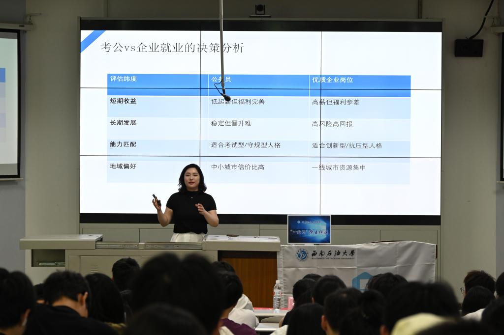 为助力计科院学子锚定职业方向,增强求职竞争力,5月8日下午3点,计算机与软件学院在第四教学楼4316教室举办求职训练营系列活动之《破局未来——大学生就业趋势与多元路径》讲座,成都蓉华同创科技有限公司西南大区总监彭莉洪担任主讲嘉宾,辅导员覃浩主持活动。