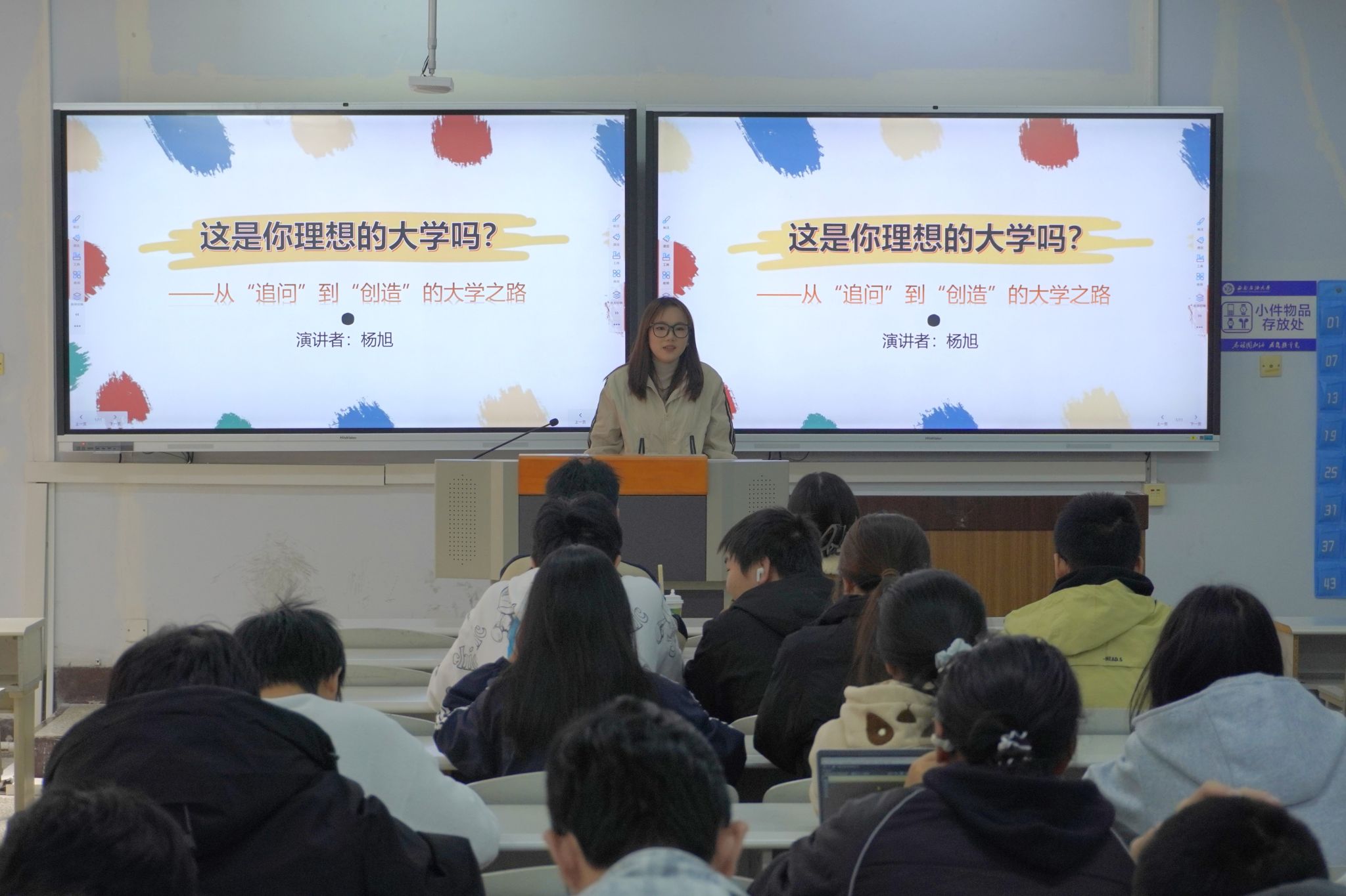 杨旭通过对比理想与现实,分享大学生活规划。活动现场互动氛围热烈,提问交流环节有序开展,充分展现了同学们的参与热情。