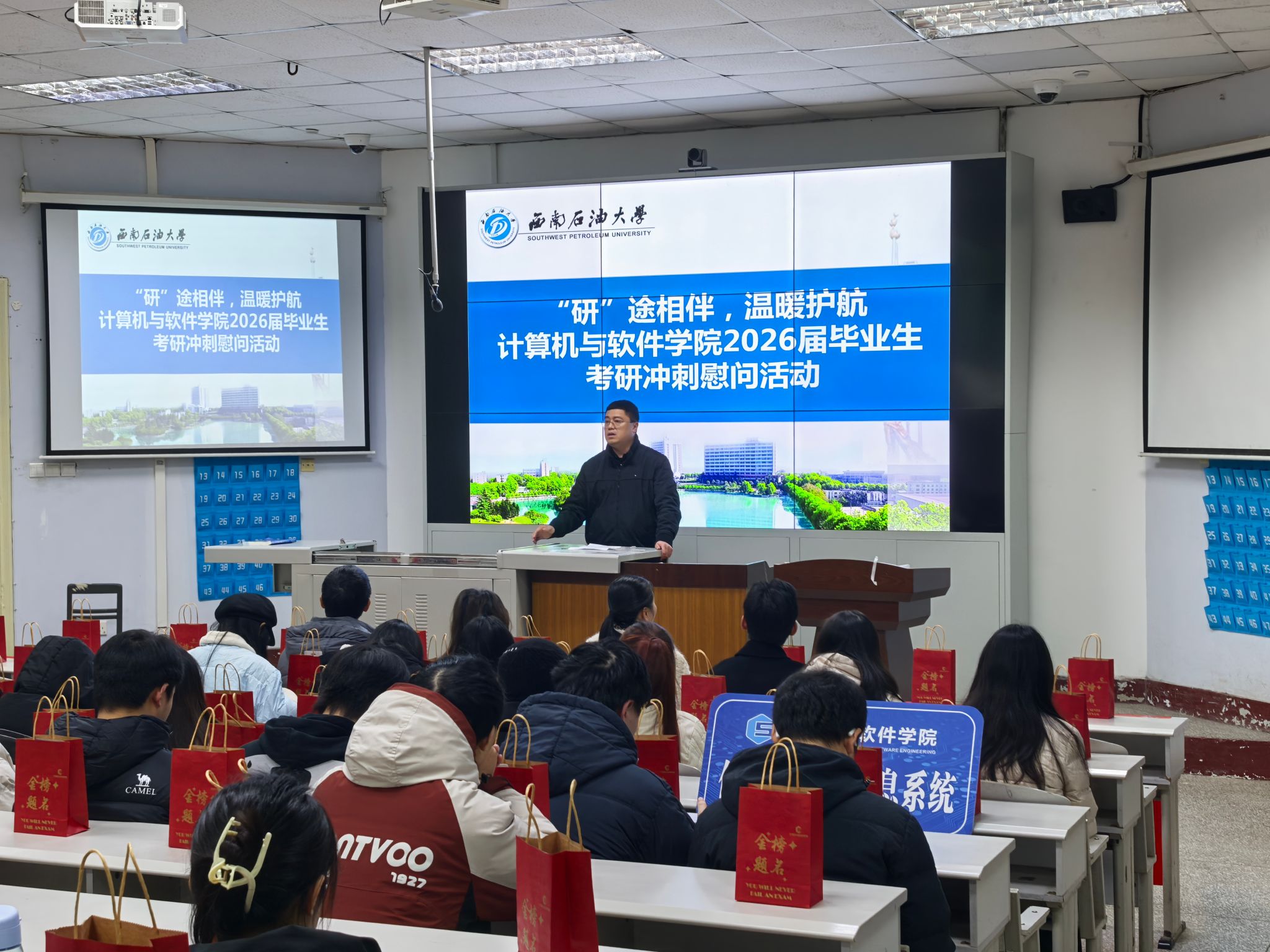 为激励备考斗志,传递学院关怀,12月9日,计算机与软件学院在第四教学楼4316教室开展“研途相伴,温暖护航”考研冲刺慰问活动。学院副院长胥林、教师代表以及全体辅导员齐聚现场,为考研学子送上暖心支持。
