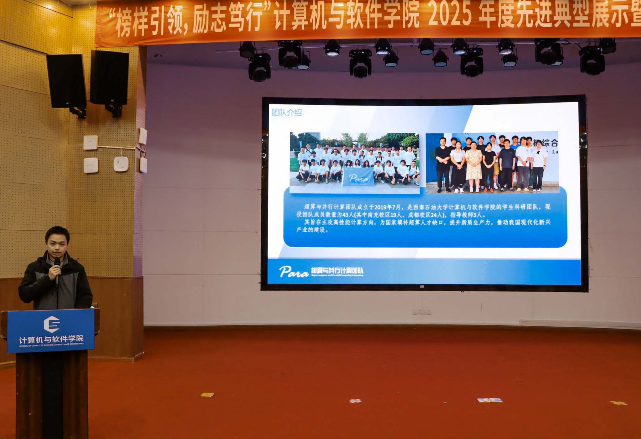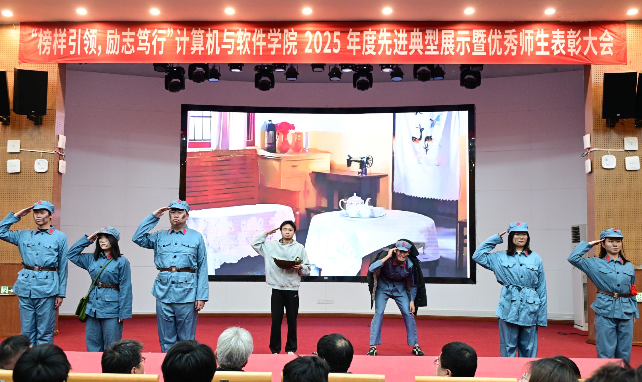 大会以精彩开场舞启幕,先进典型展示环节亮点突出。获“飞翔团队奖”的超算与并行计算团队现场展示硬核技术成果;国家级竞赛获奖学子代表分享备赛的坚守与突破;串场节目《铁锅里的长征》以艺术形式融入红色励志精神,引发全场共鸣。